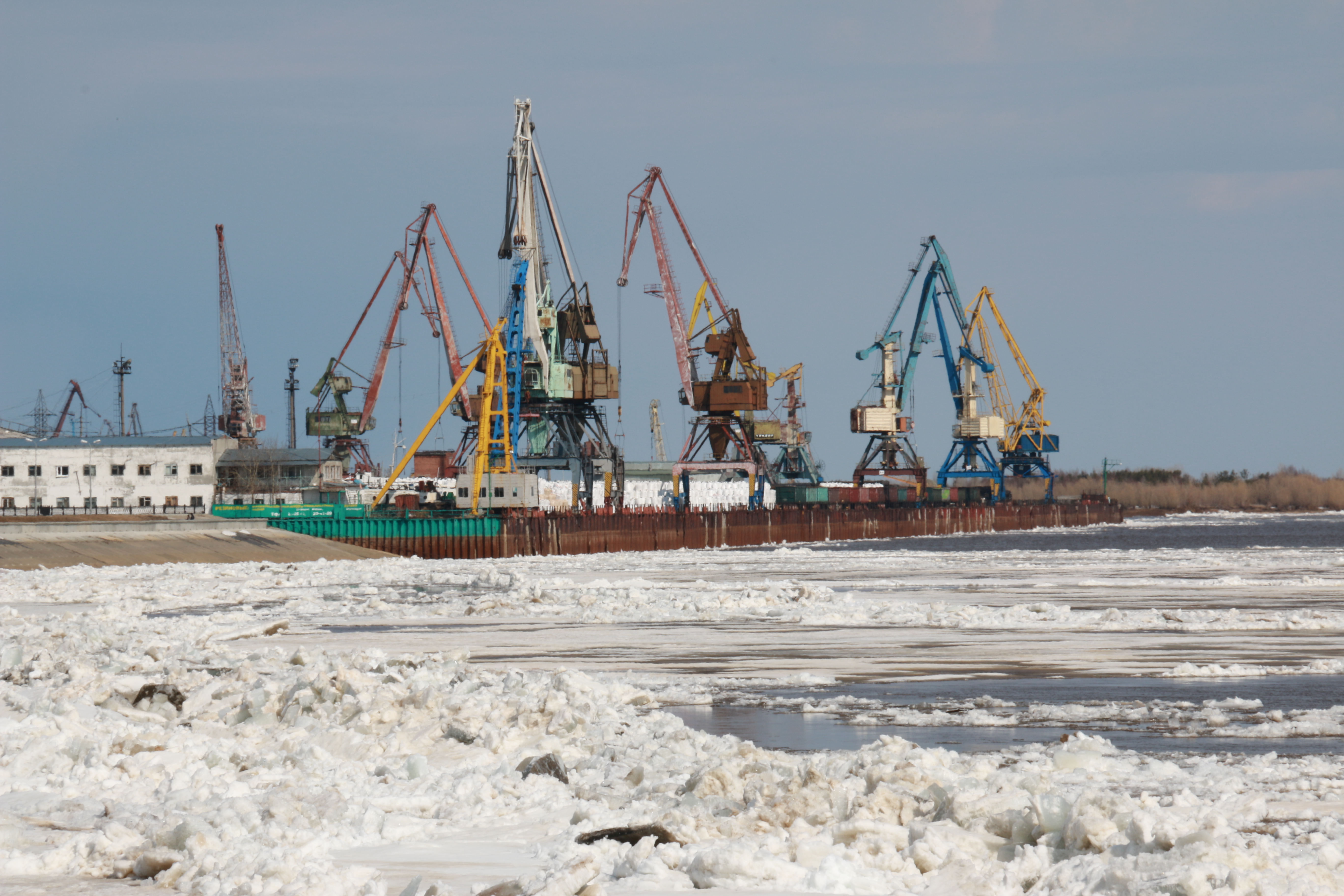 мы гуляли по набережной и фотографировали ледоход. Пройдя чуть дальше к речпорту, я увидела разноцветные краны. Подумала, что получится хороший кадр