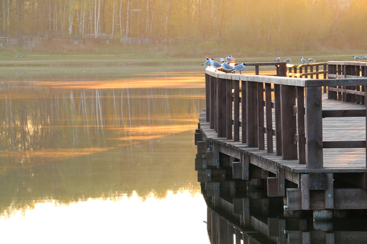Мягкий свет утреннего солнышка, добавляет сюжету объем. Хорошо выделяется мостик в переднем плане. Длинное фокусное расстояние объектива помогает сжат планы пейзажа, пространство смотрится более компактным, детали в изображении располагаются ближе друг к другу.