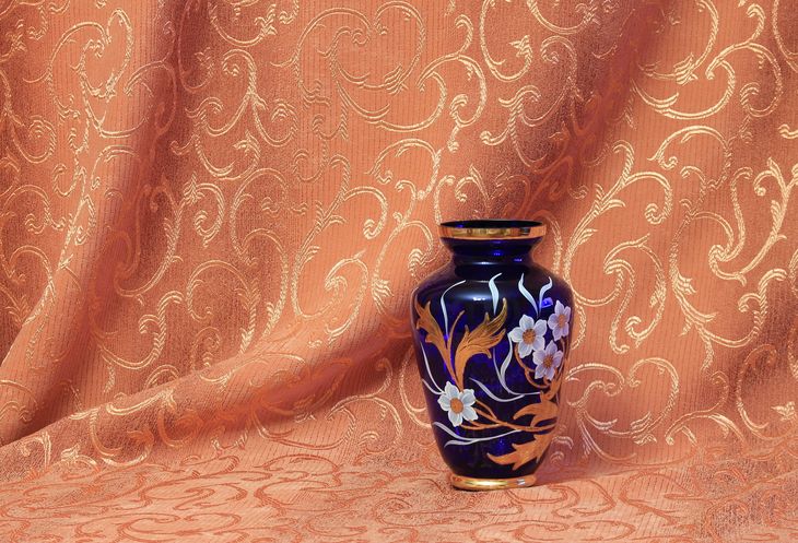 Ваза и в самом деле очень красивая. Хорошо подобрали фон для нее, она выделяется контрастом. Рисунок на вазе перекликается с рисунком на ткани. Камера хорошо закреплена на штативе, при использовании длинной выдержки получилось резкое изображение. Небольшой перевес в желтоватые оттенки делает картинку мягче, теплее. Складочки на ткани удачно направляют взгляд.
