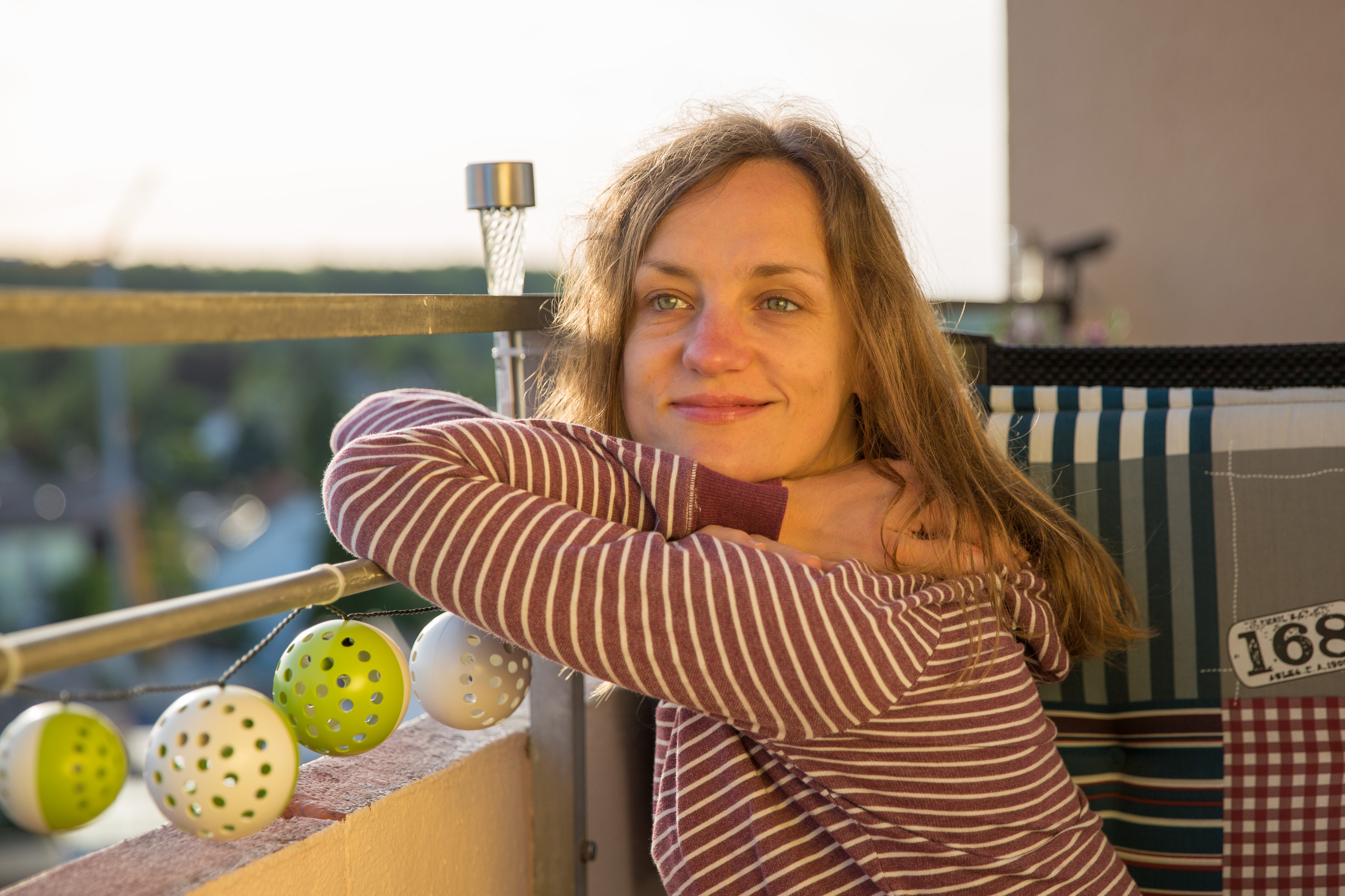 Закат солнца на балконе. Я использовал золотистый отражатель, который придал всему снимку мягкий теплый оттенок.