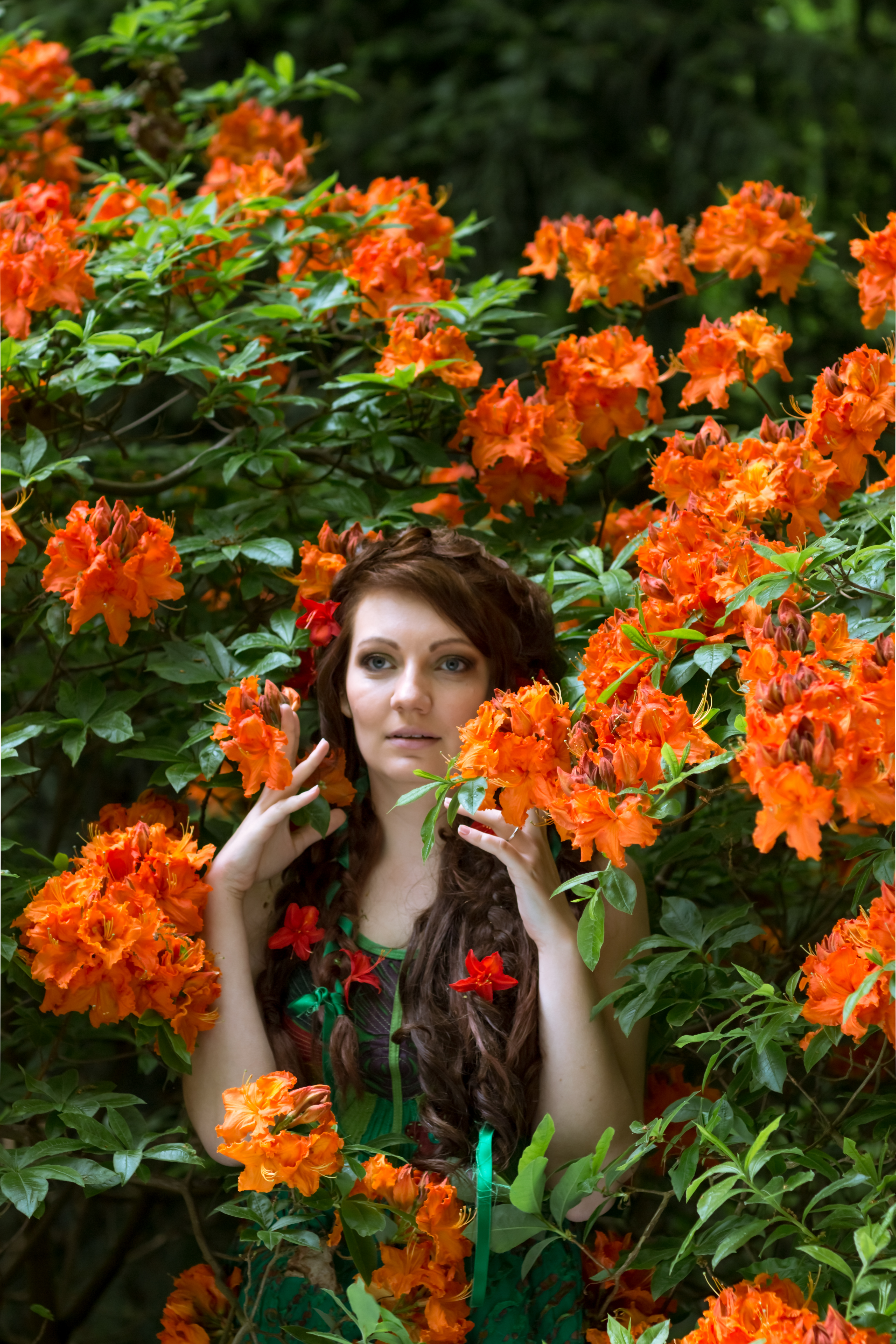 Очень красиво! Место для съемки нашли просто обалденное, такие пышные цветы, такой насыщенный и необычный цвет бутонов, фон с данным освещением получает шикарный объем. Девушка в интересном платье и с красивой прической, и все это отлично интегрировано в среду, не выбивается по стилю.