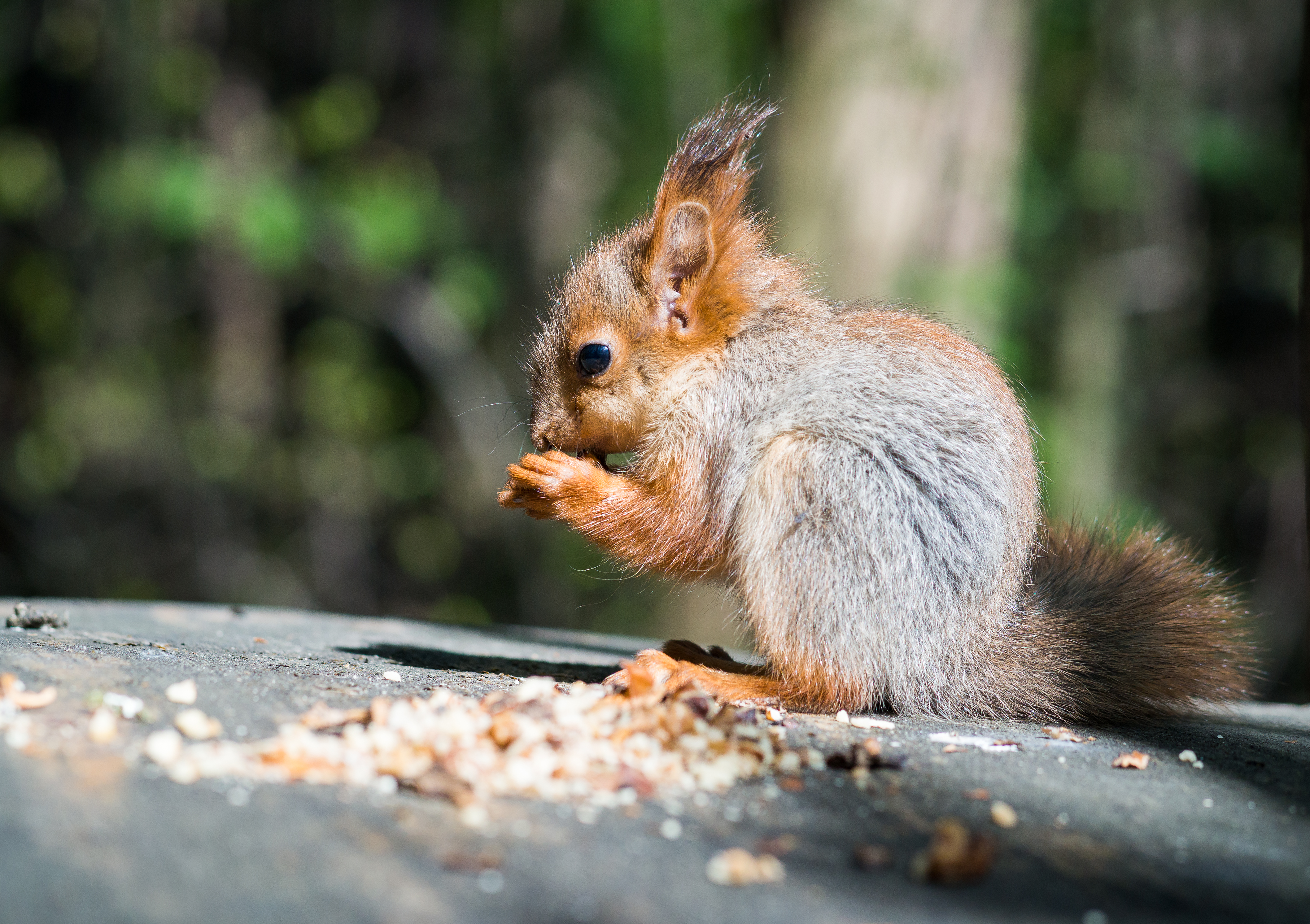 Очень интересный кадр, центральная композиция позволила создать доминирующий визуальный акцент на белке, малая глубина резкости делает снимок более объёмным и хорошо разделяет планы, общая цветовая гамма достаточно насыщенная, высокий контраст так же придаёт снимку больший визуальный интерес, продолжайте в том же духе!