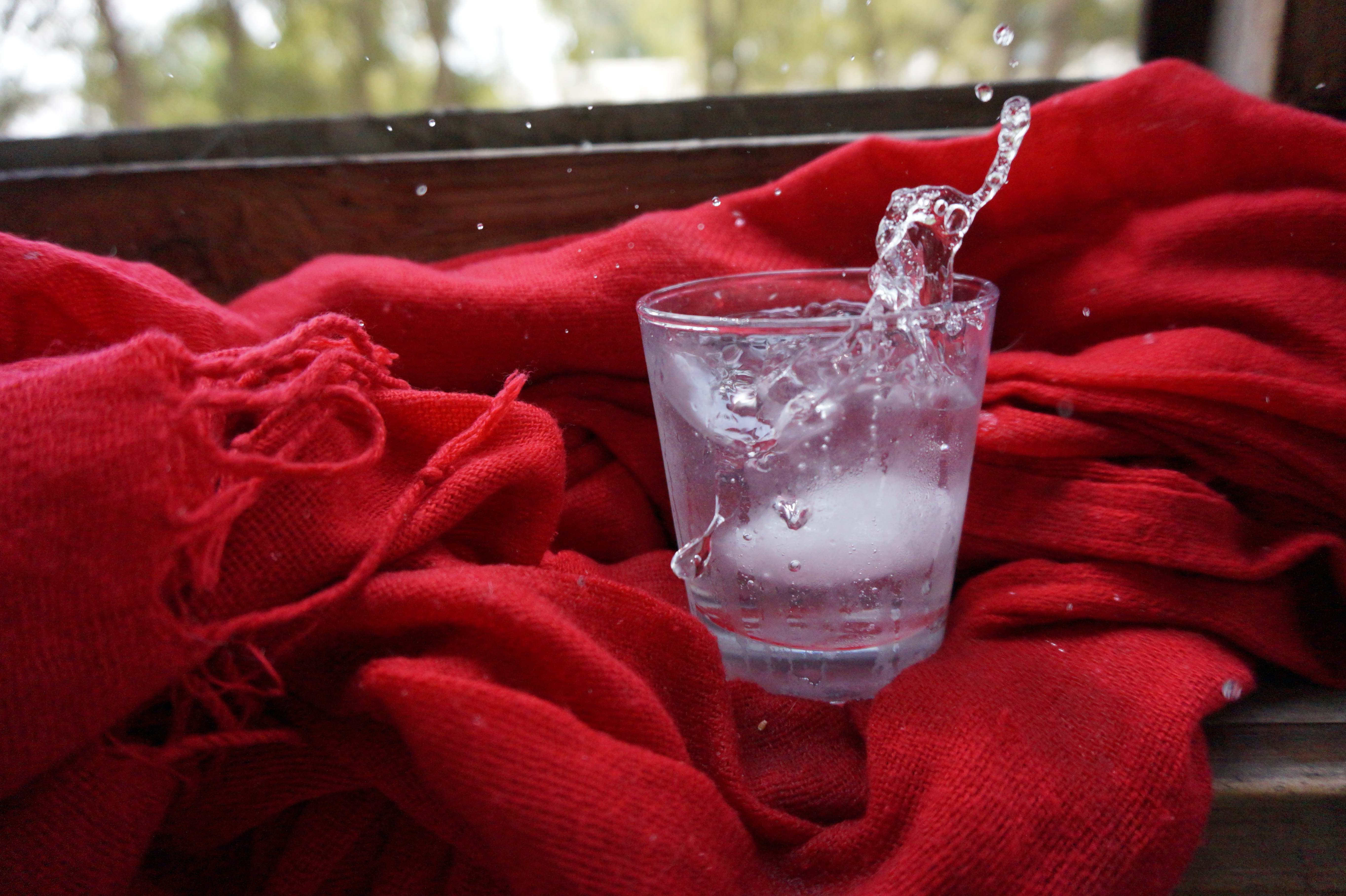 В кадре пойман отличный динамичный момент, присутствует движение, красиво выглядят застывшие брызги воды, хорошо выглядит цветовое сочетание между насыщенными красными тонами ткани на заднем плане и серыми оттенками стакана, подчёркнута фактура, мягкое рассеянное освещение создаёт объёмный свето-теневой рисунок, так держать!