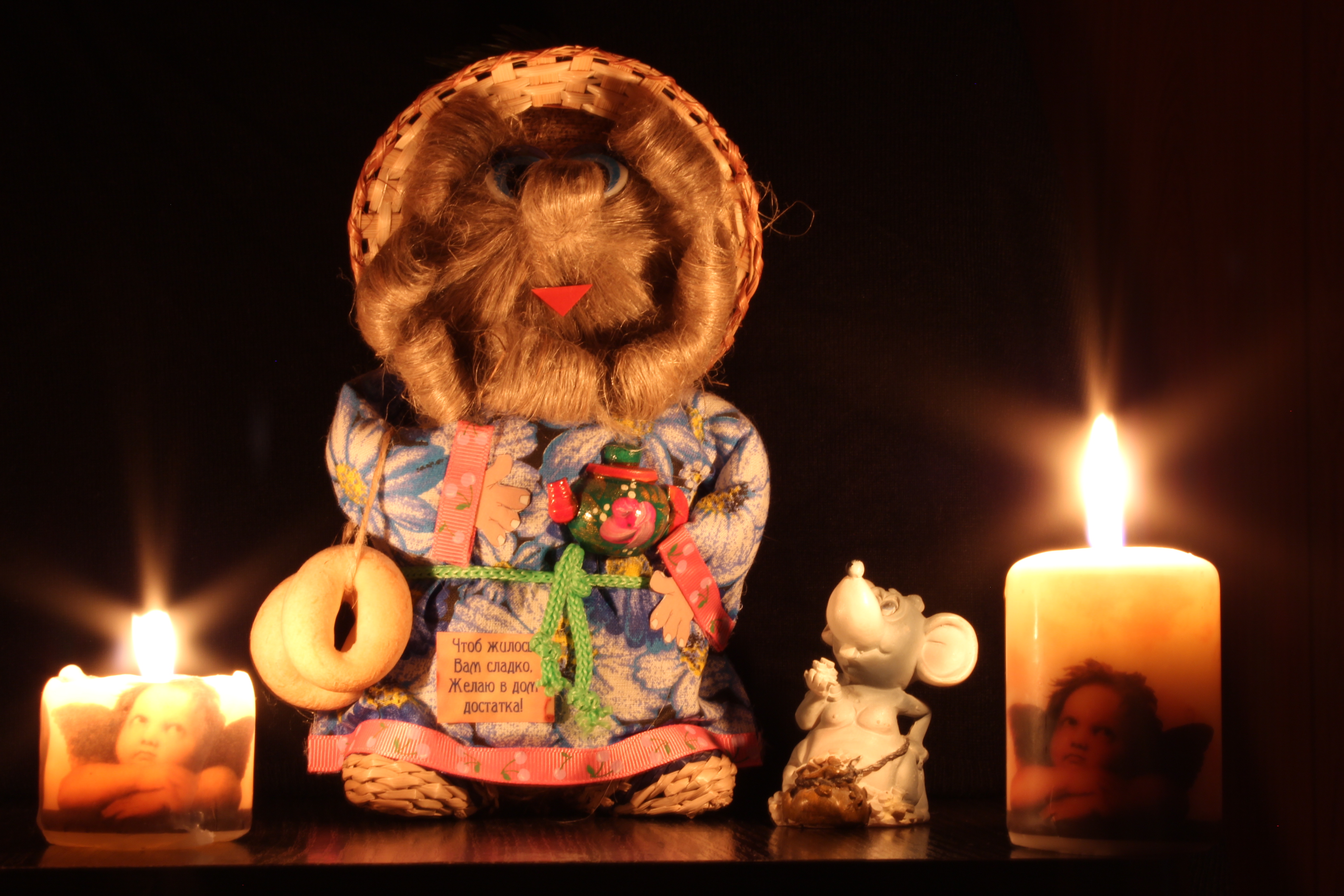 Маленькая рекомендация - подбирать предметы для натюрморта так, чтобы они подходили по стилю. Ангелочки несколько выбиваются даже по смыслу, а вот мышь с домовенком хорошо сочетаются.