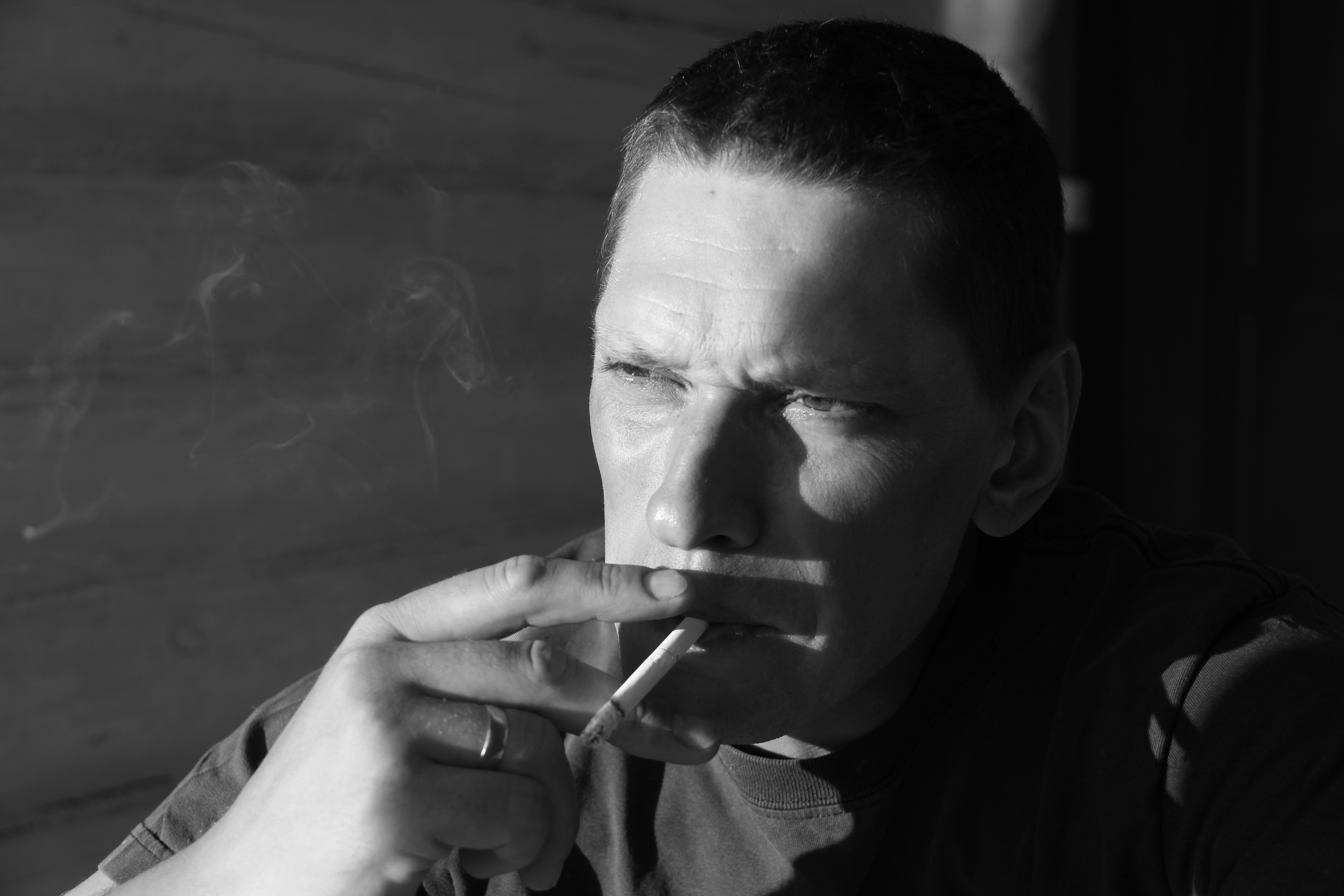Очень интересный снимок, чёрно-белый формат изображение хорошо подходит для данной работы т.к. в кадре жёсткий контрастный свет, подчёркнуты формы и силуэт портретируемого, снимок графичен, пойман удачный момент, присутствует атмосфера и настроение, снимок похож на кадр из фильма благодаря присутствию некоторого сюжета, создан активный визуальный акцент на взгляде портретируемого, продолжайте в том же духе!