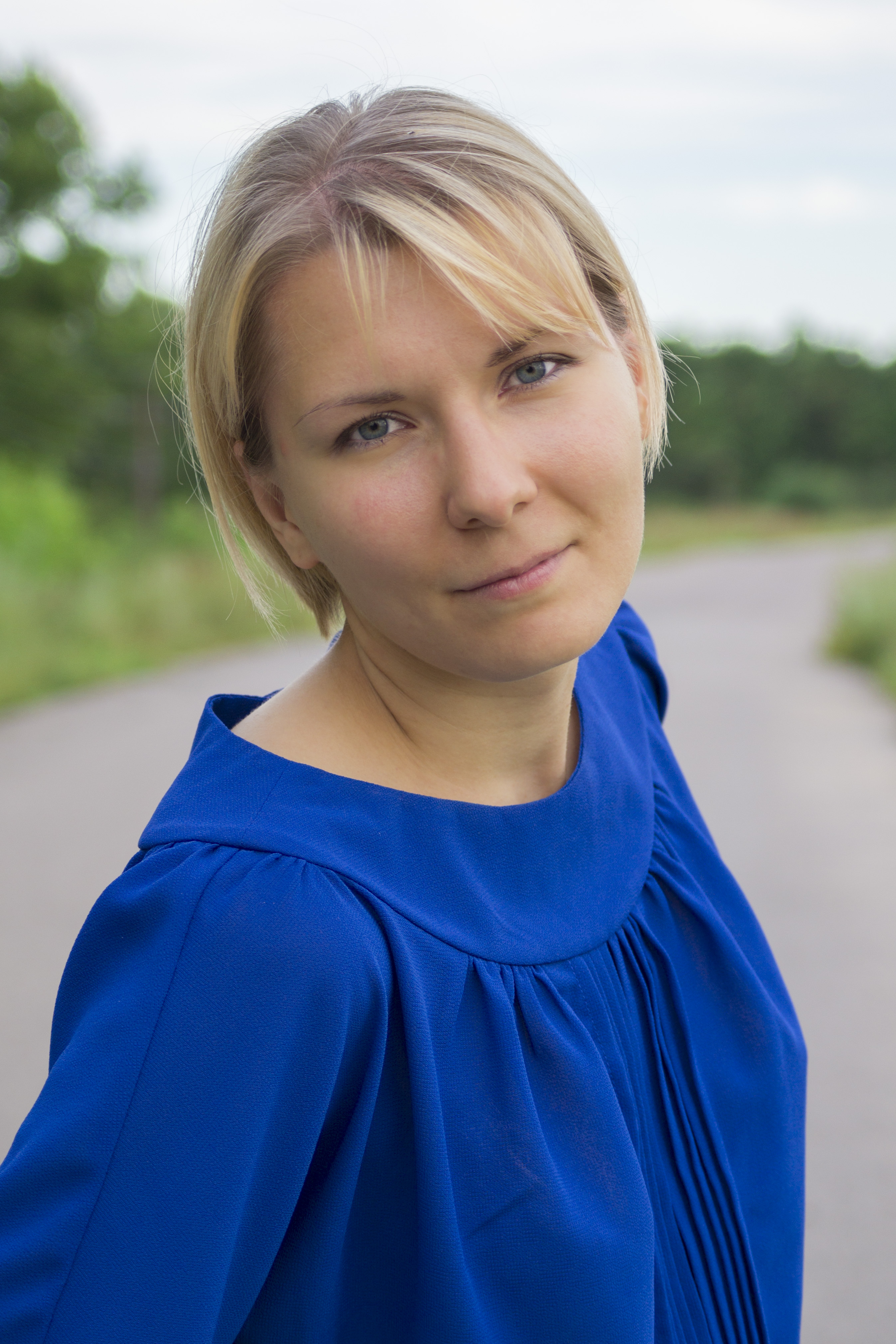 Здравствуйте. Постарался создать диагональ слева направо за счет линии плеч и руки, а также наклона головы. В качестве фона послужила уходящая в даль дорога с небольшим лесом. Погода была немного облачной, солнце уже было низко. Исходный кадр был кадрирован с небольшим поворотом.