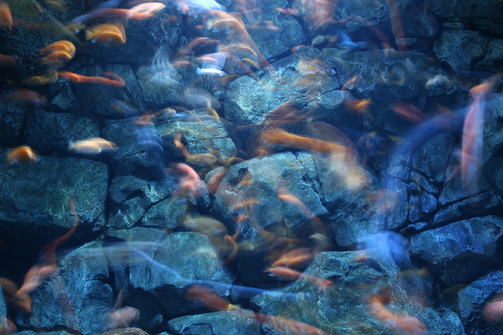 Это рыбы в воде? Похоже. Или листочки? Да не важно. Это художественный образ. Художественное фото. Оно даёт ощущение движения. Прекрасно доминируют яркие тёплые краски на холодном фоне. Это важно.