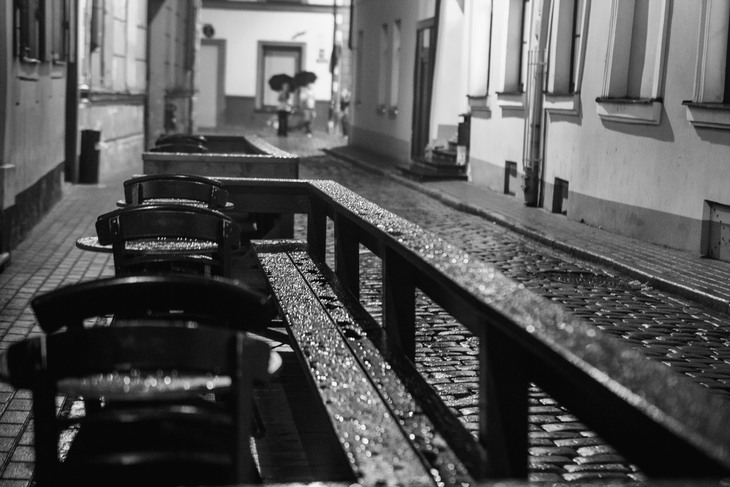 Но факт, что смотрится здорово. С особым настроением. С великолепным объемом, который дарит многоплановость и линейная перспектива, которая донесена и видом поручня, и сходящимися линиями улицы.