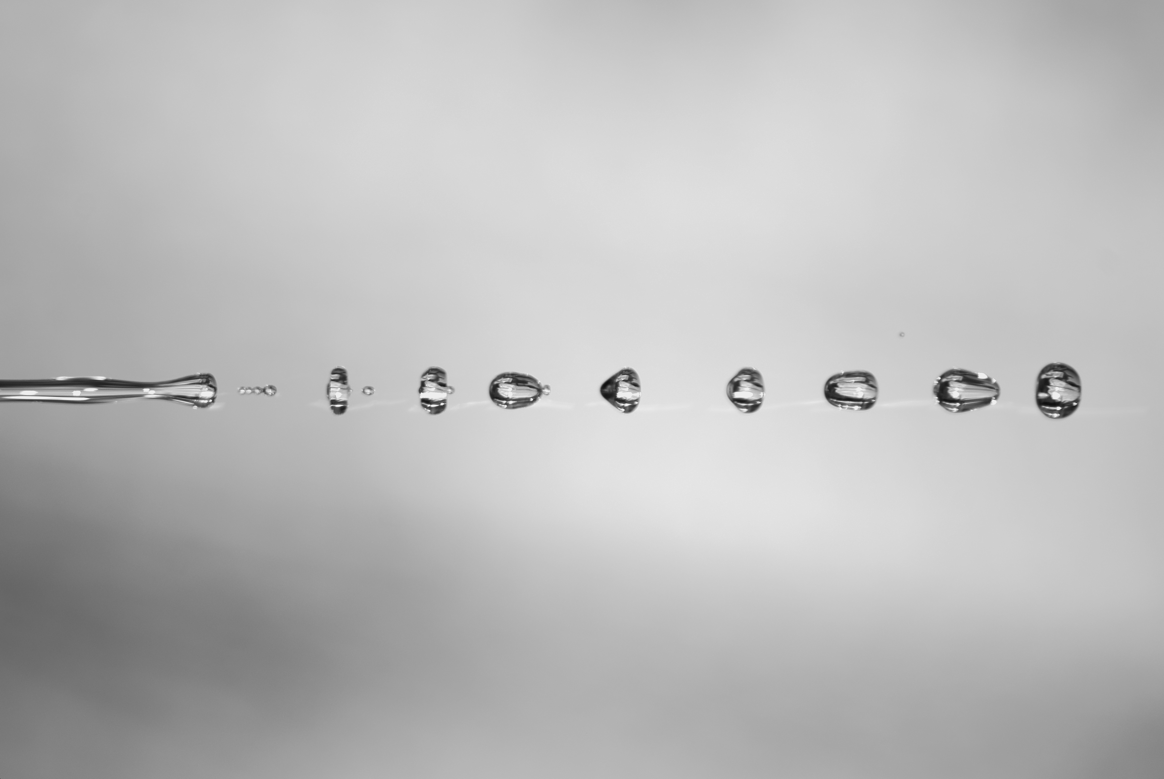 Необычная "стрельба"! Объекты прозрачные и мелкие - не самый легкий случай хотя бы для фокусировки. Фон однотонный, с незначительными переходами плотности, прекрасно выделяет на себе резкие капельки, очерченные более плотным цветом. Играют контрасты, и в ЧБ снимок смотрится прекрасно.