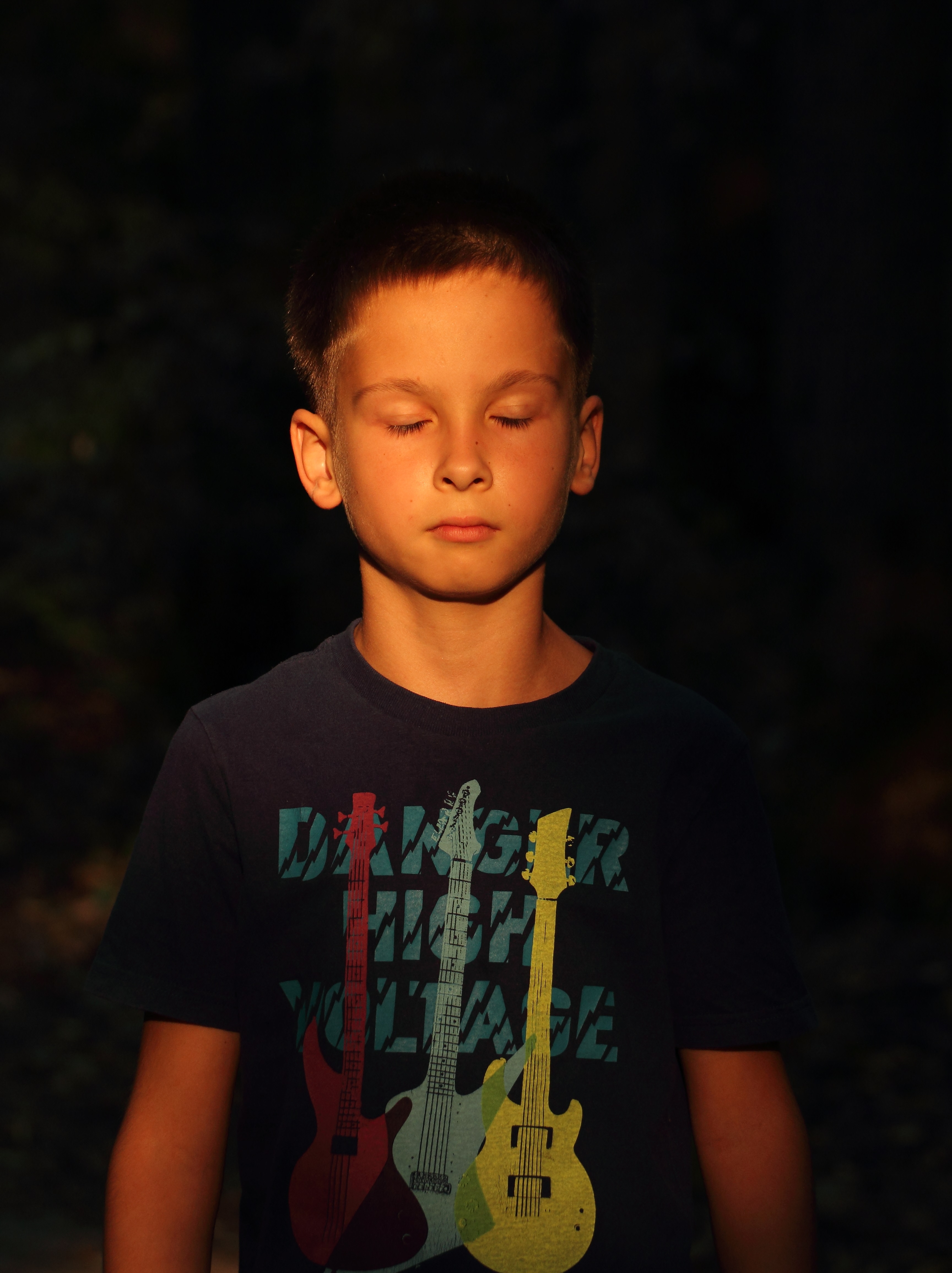 На лицо и шею попадает больше всего света, и это получается прекрасный точечный акцент, мимо которого не пройдешь. Хотя и темные краски вокруг, теплый тон лица не позволяет снимку сделаться мрачным. Интересно "играют" гитары на футболке, можно подумать, что у героя звучит музыка в голове в этот момент.