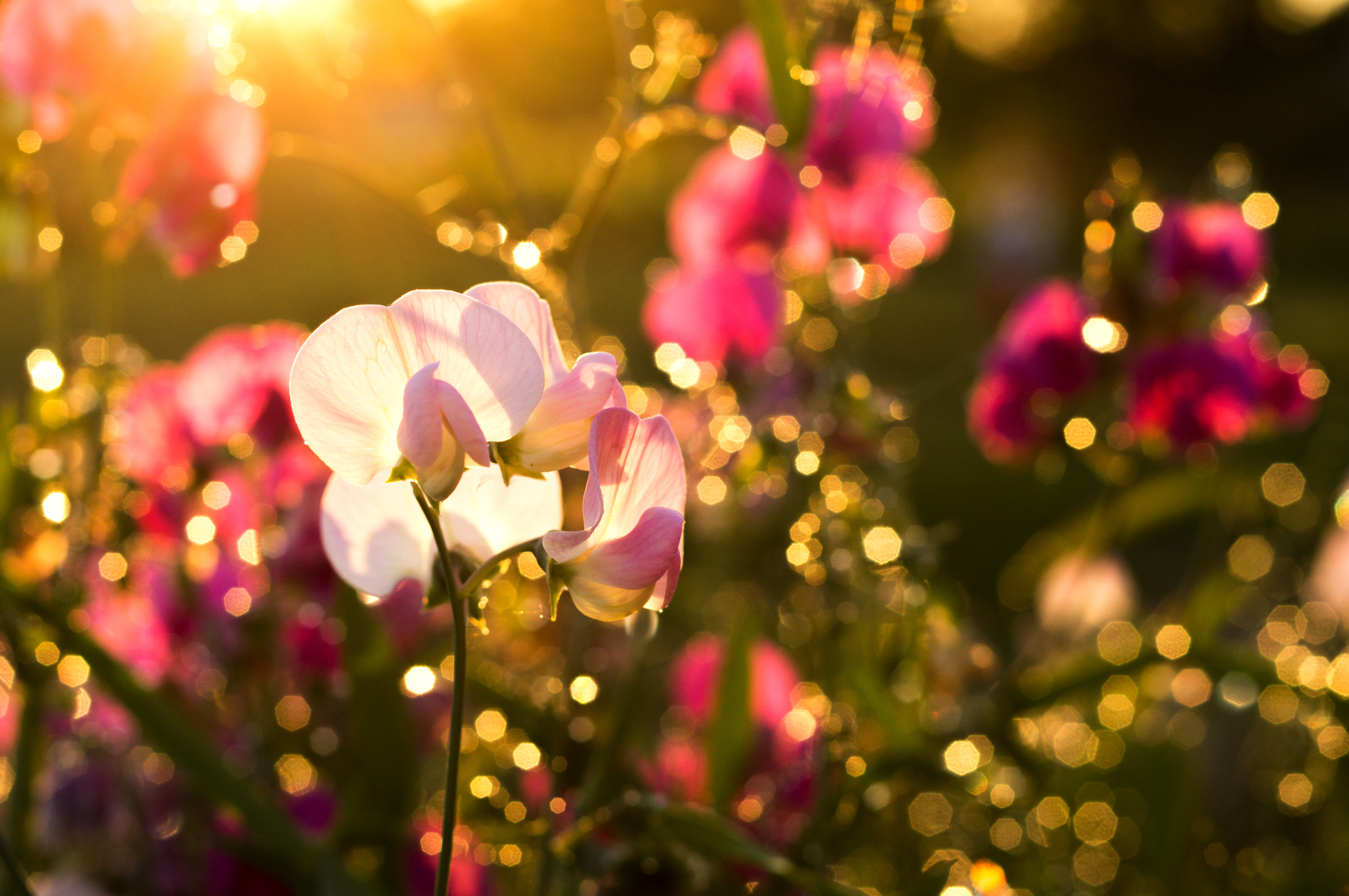 Меня заворожило, как просвечиваются лепестки декоративного гороха с лучах заходящего солнца после дождя. На заднем плане из капелек получилось красивое боке.