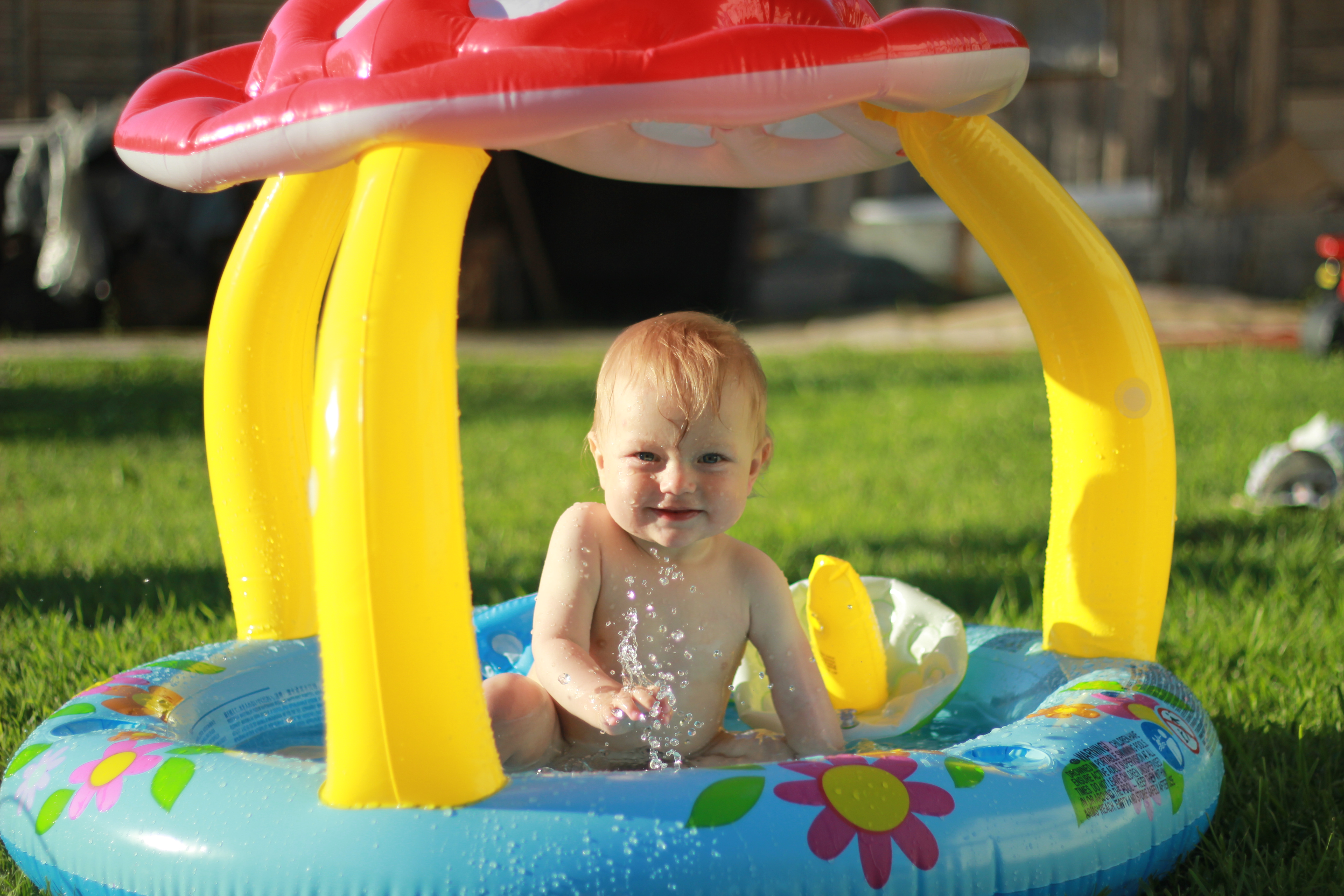 - три жёлтых опоры надувного бассейна создают хорошее визуальное обрамление ребёнка, а так же привносят в кадр яркий цветовой акцент.