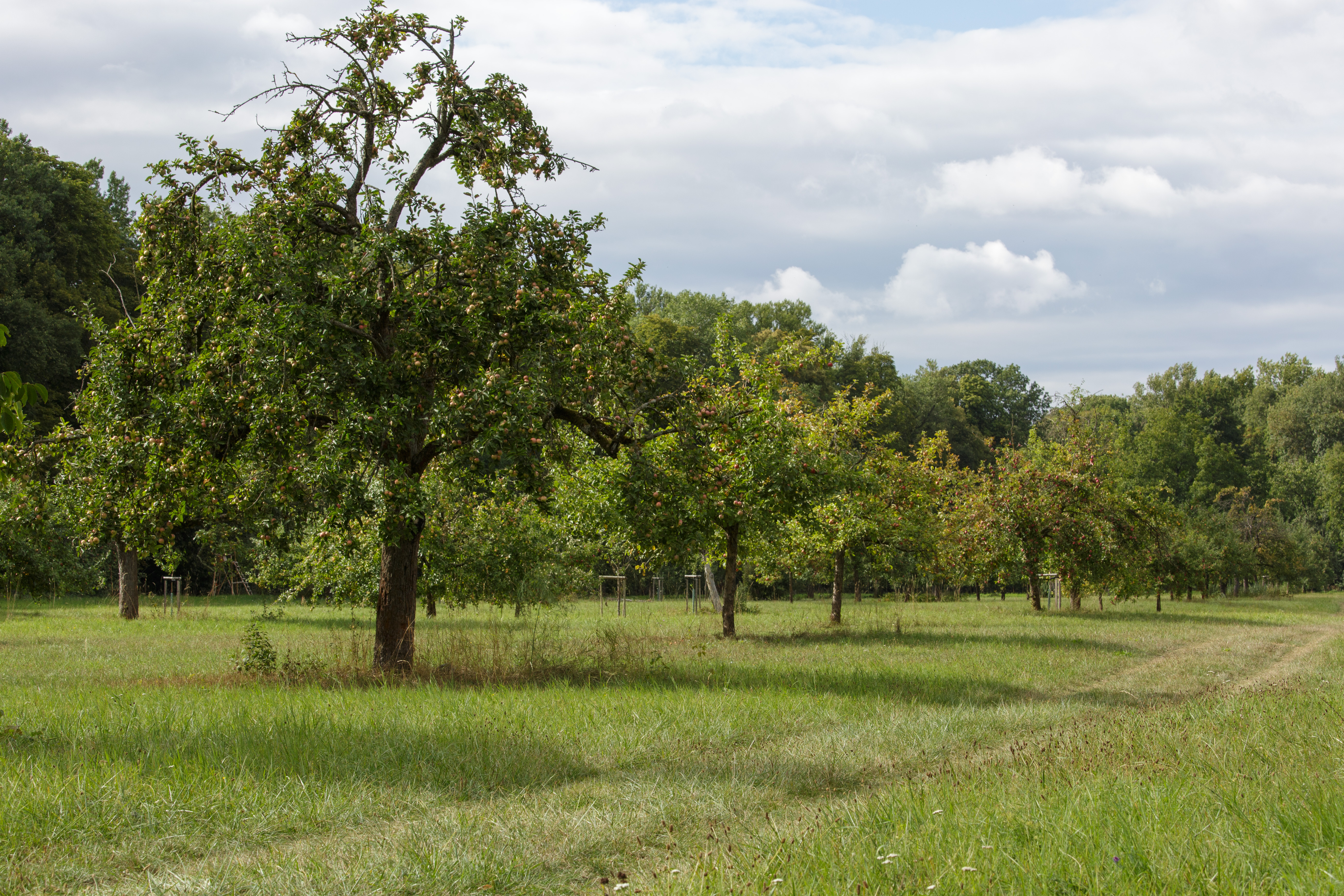 Один осенний день в яблоневом саду. Уходящая вдаль дорога создает линейную перспективу в кадре. Также и последующие стоящие вдоль дороги яблони уменьшаются и создают глубину.