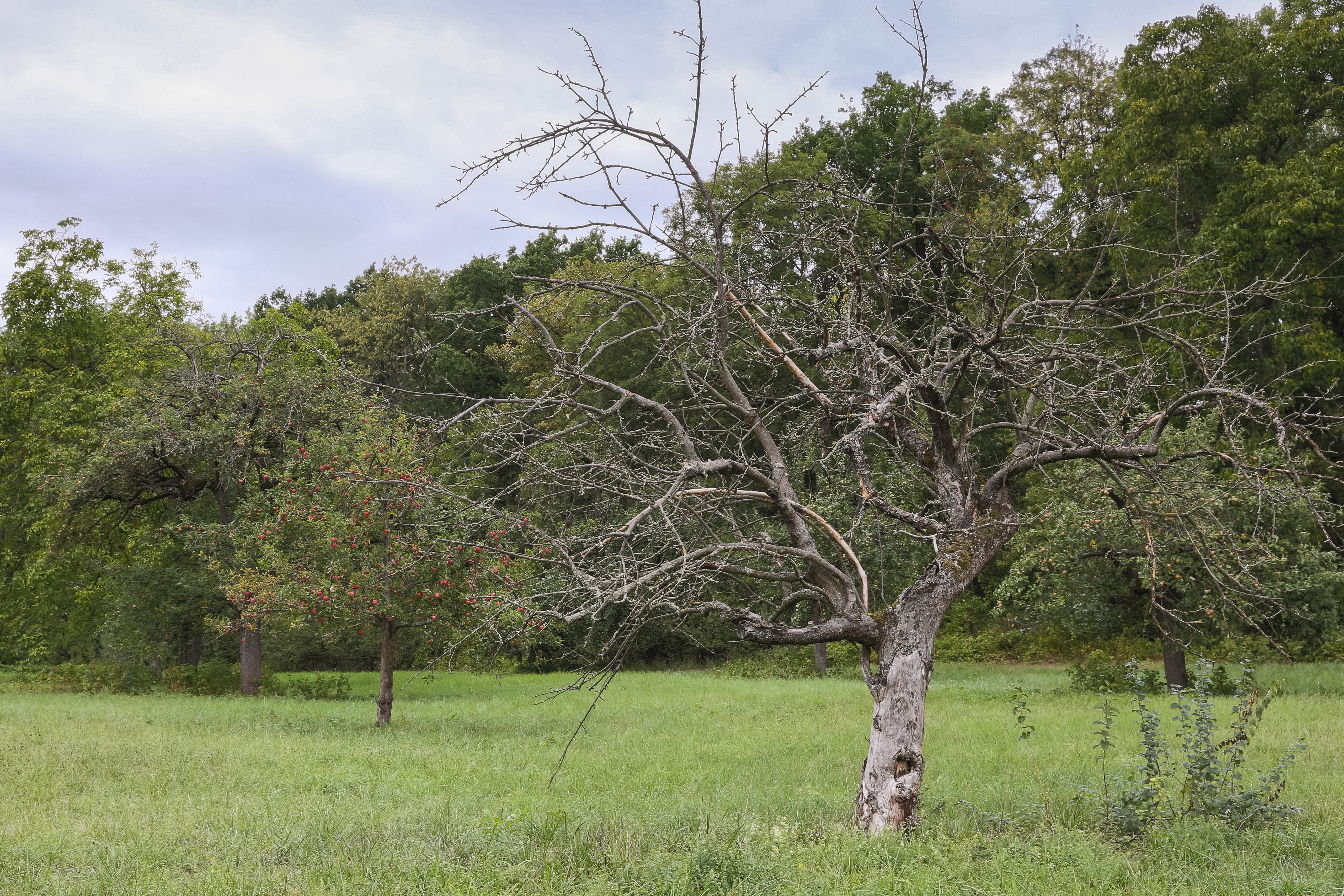 Жизнь и смерть в яблоневом саду )) На переднем плане мертвое засохшее дерево, вдали же видны яблони, усыпанные яблоками. Дерево и край леса делят фотографию на трети. Гармоничная фотография ))