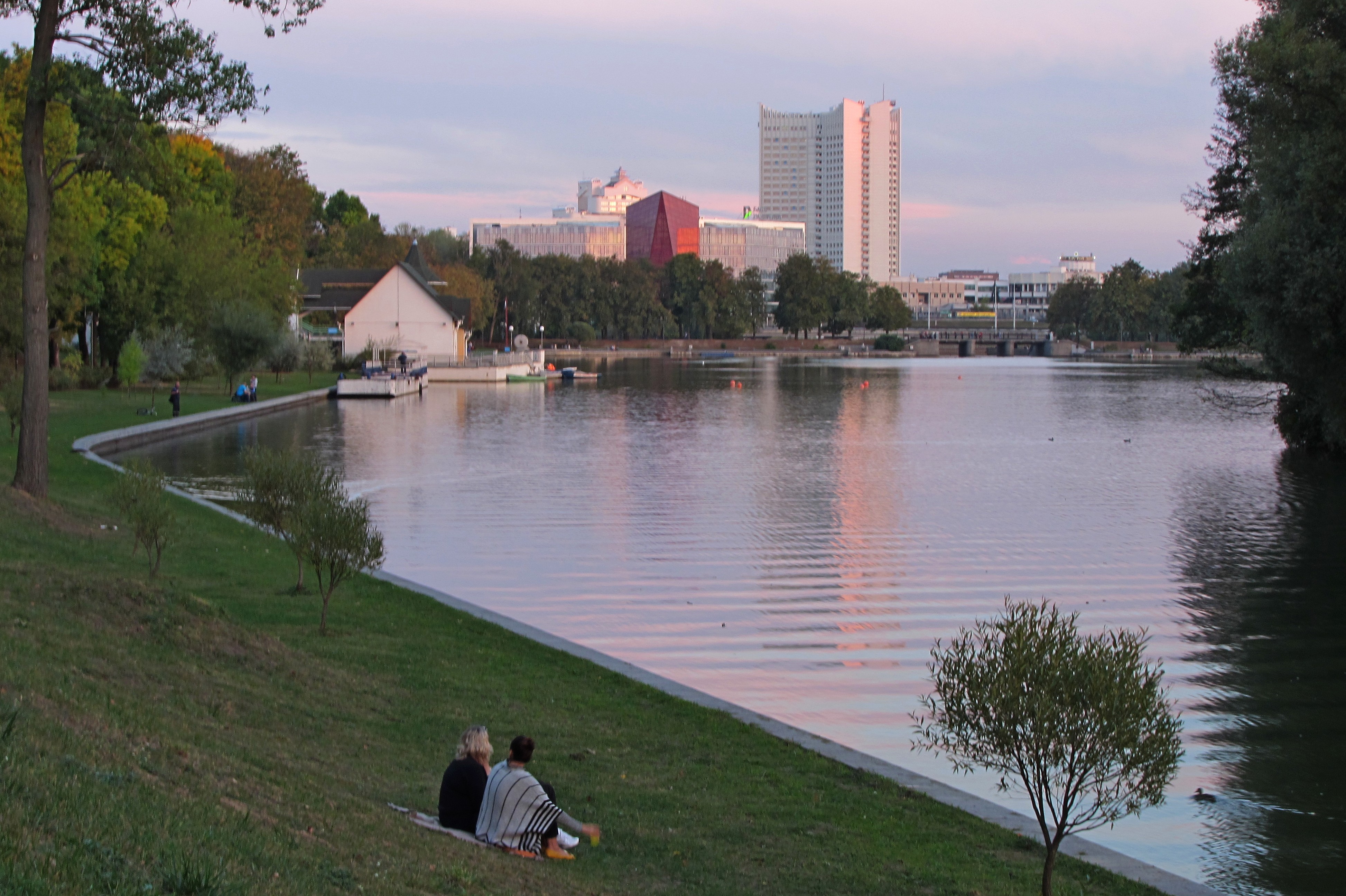 Очень красивая линия! Правда, она ведь не замкнутая, справа ведь открытая вода. Ну, это не суть важно) Это прекрасная направляющая линия, по ней органично погружаемся вглубь пейзажа. И там, вдалеке, манят теплым высокие здания, туда хочется двигаться. Кстати, удачно еще то, что девушки смотрят, как раз, туда же.
