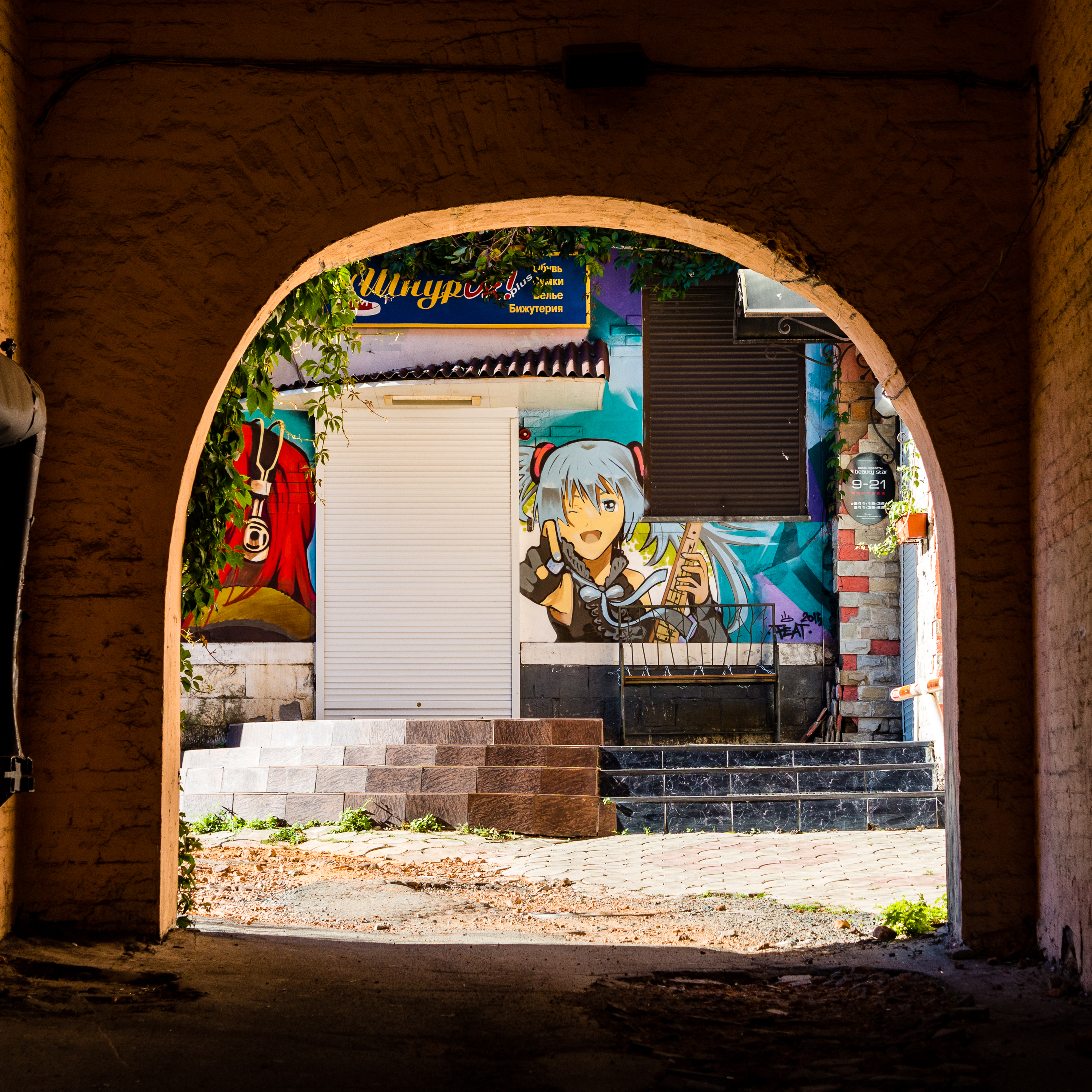 Через арку виим внутренний дворик с граффити на стене. Много темного (смотрим как бы из пещеры) на залитый солнцем дворик. Картинка контрастная, резкий переход к свету. Снимок статичный, движения нет, да и фигура на стене делает останавливающий жест рукой.Главное - яркое граффити на стене, контраст меду темной аркой и светлым двором. Ощущение - взгляд в другой, фантастический мир.