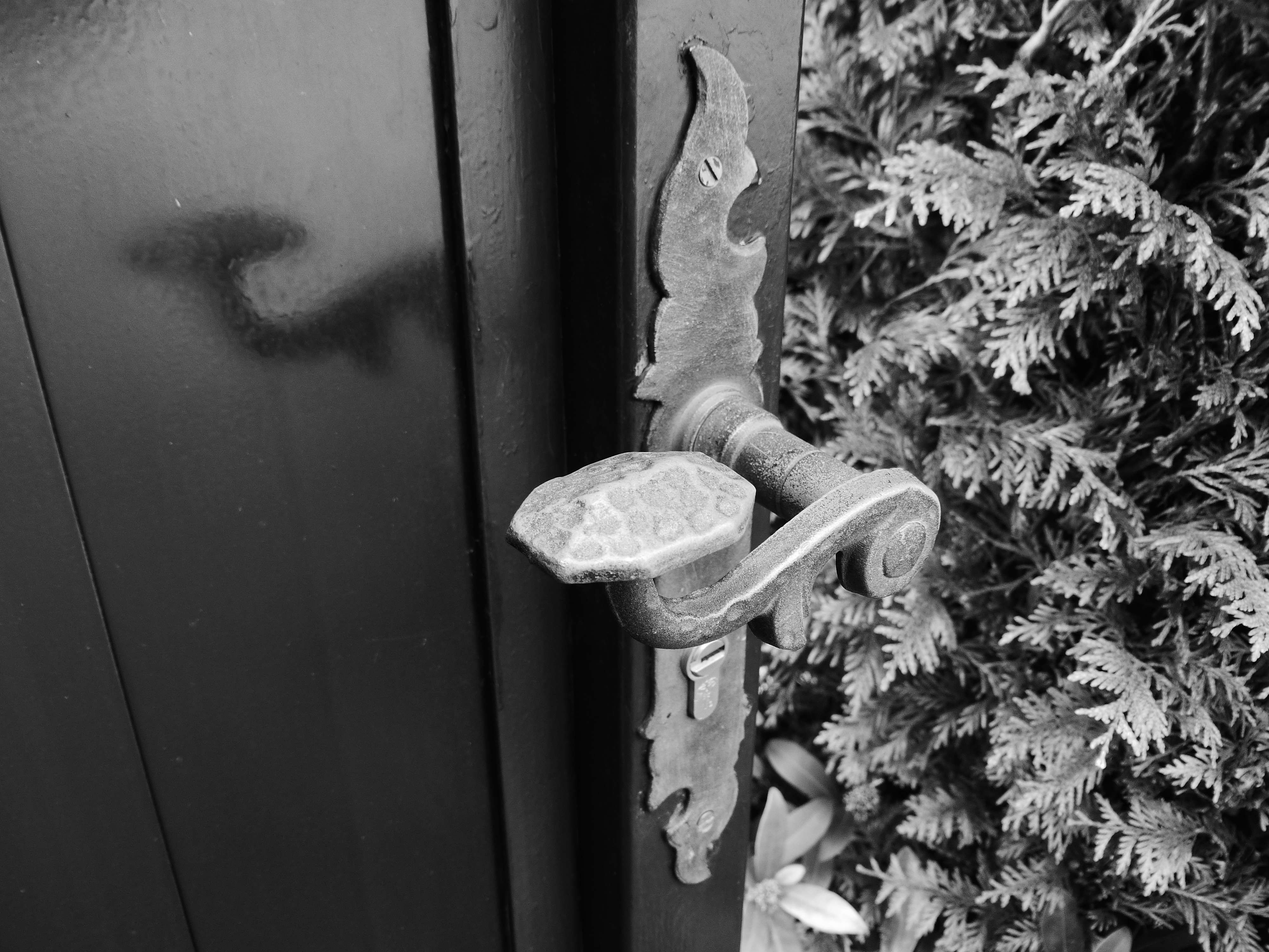 Все сделали верно, и сняли очень интересный снимок. ЧБ вариант здорово смотрятся именно на таких работах, где главное фактура, а не цвет! Здорово сочетается фактура дерева двери, шершавого металла, куста на заднем плане. Технически получилось отлично, автоматика справилась хорошо!