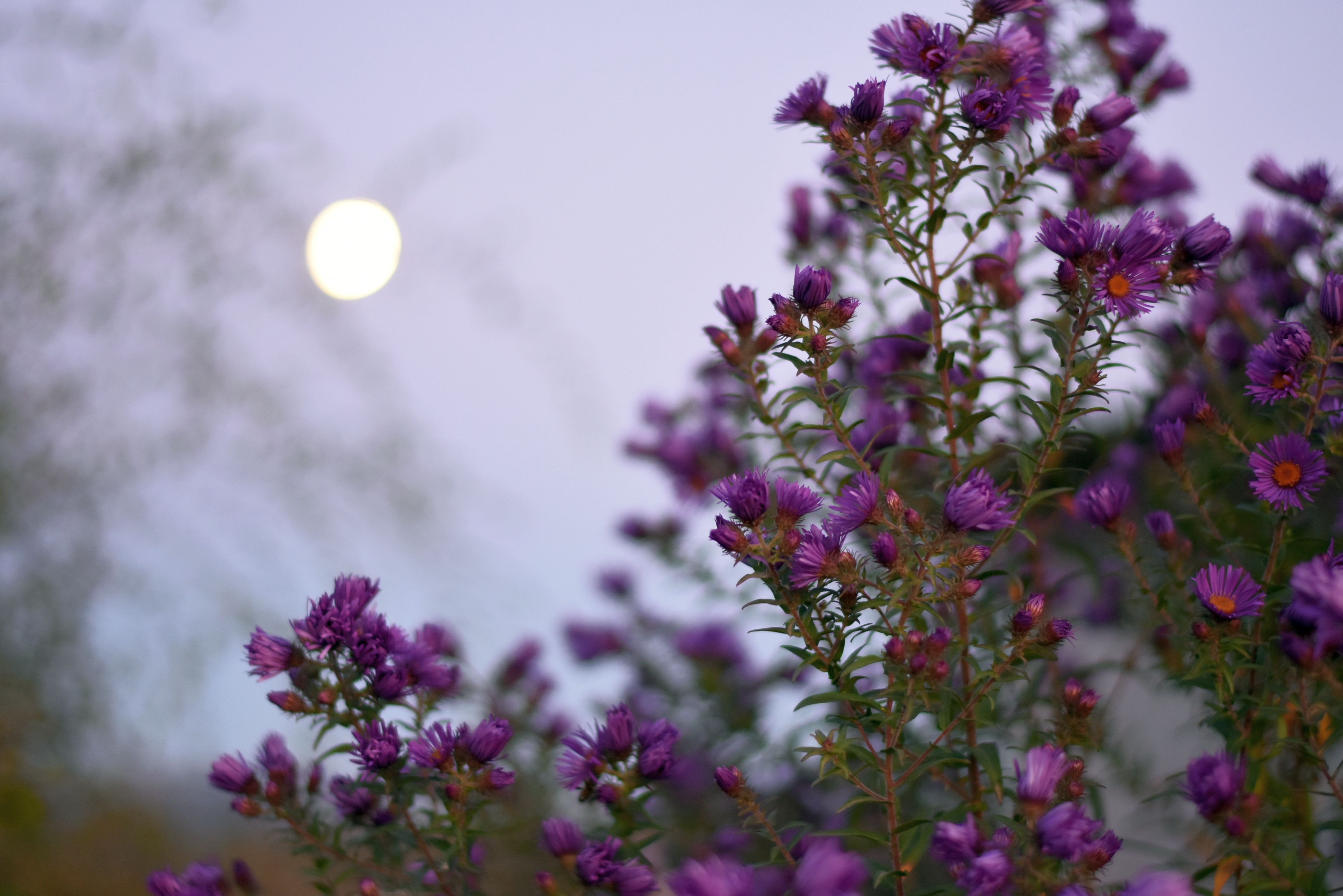 Суперлуние. На первом плане ближние цветы , далее еще цветочки и деревья и , наконец, дивная луна.