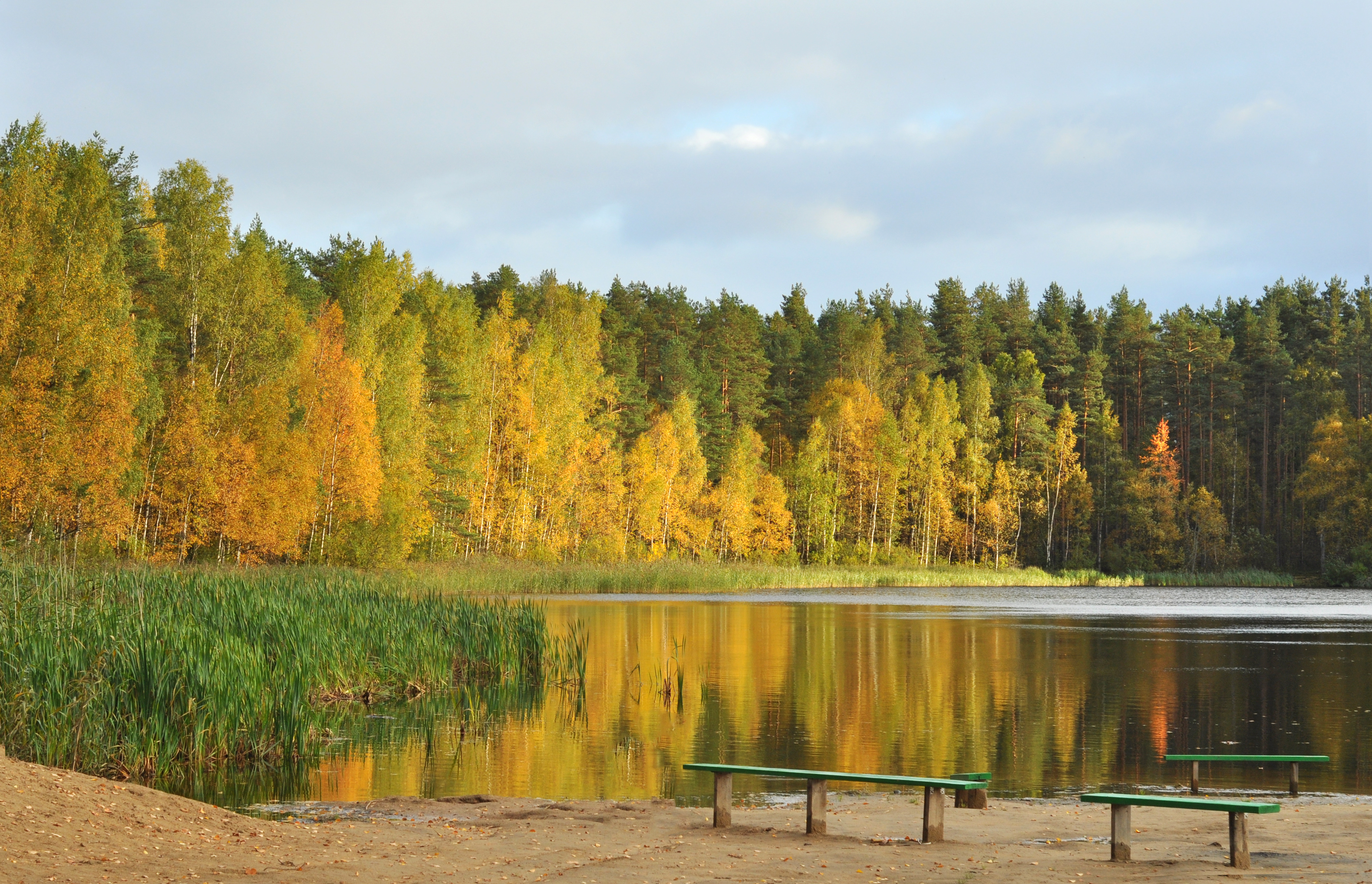 Вот теперь удалось поработать именно с передним планом. Элементы переднего плана, лавочки, выступают в качестве своеобразной точки отсчёта, с которой зритель начинает знакомство с сюжетом. Затем взгляд переносится к красивым отражениям и деревьям, ведь они акцентированы цветом.