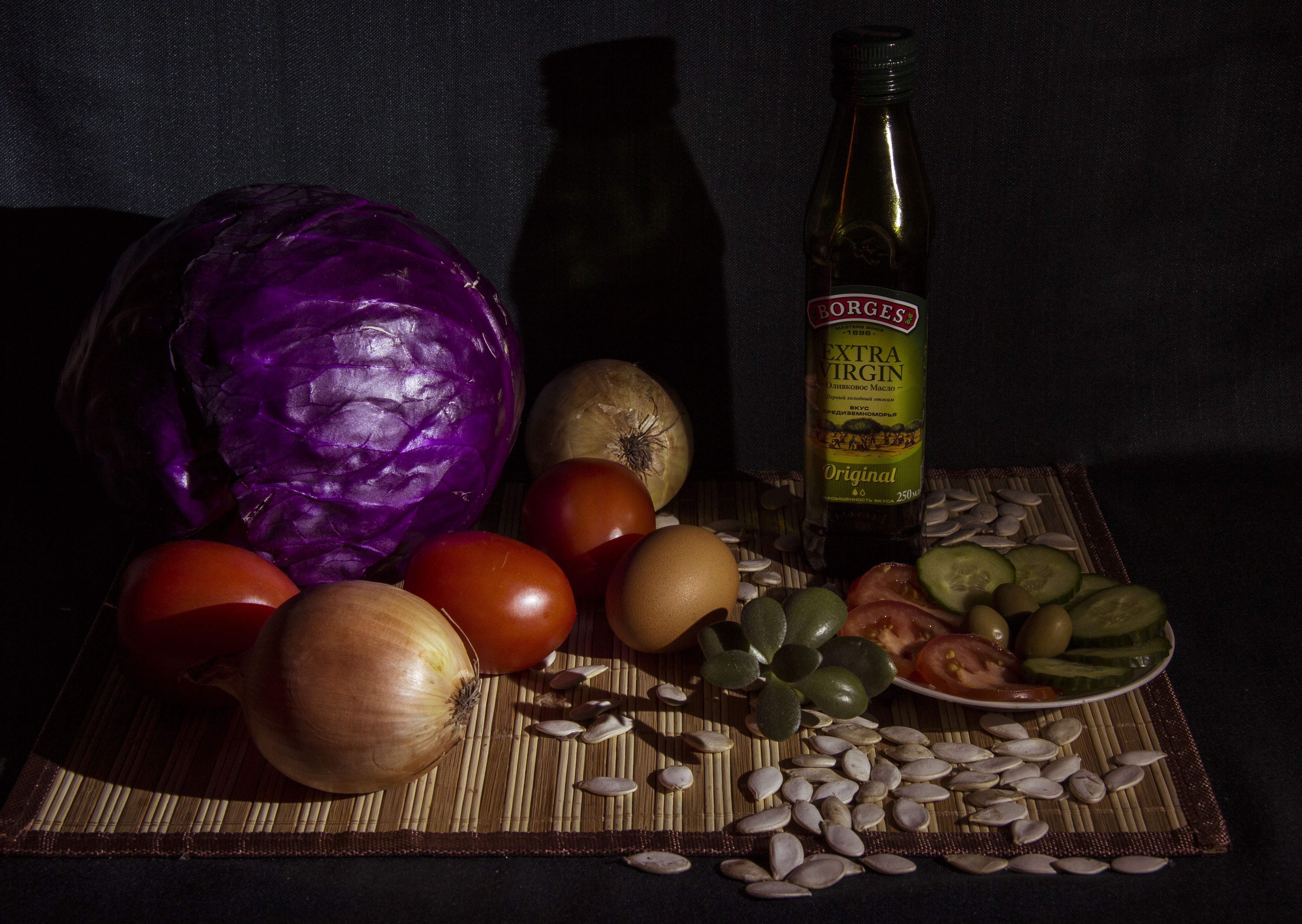 Мне нравится этот снимок, смотрится интересно. Контрастное освещение и сдвиг экспозиции в минус, дает довольно темные и контрастные тени. Снимок имеет приятный колорит, довольно теплые оттенки и яркий акцент на насыщенно-фиолетовой капусте.