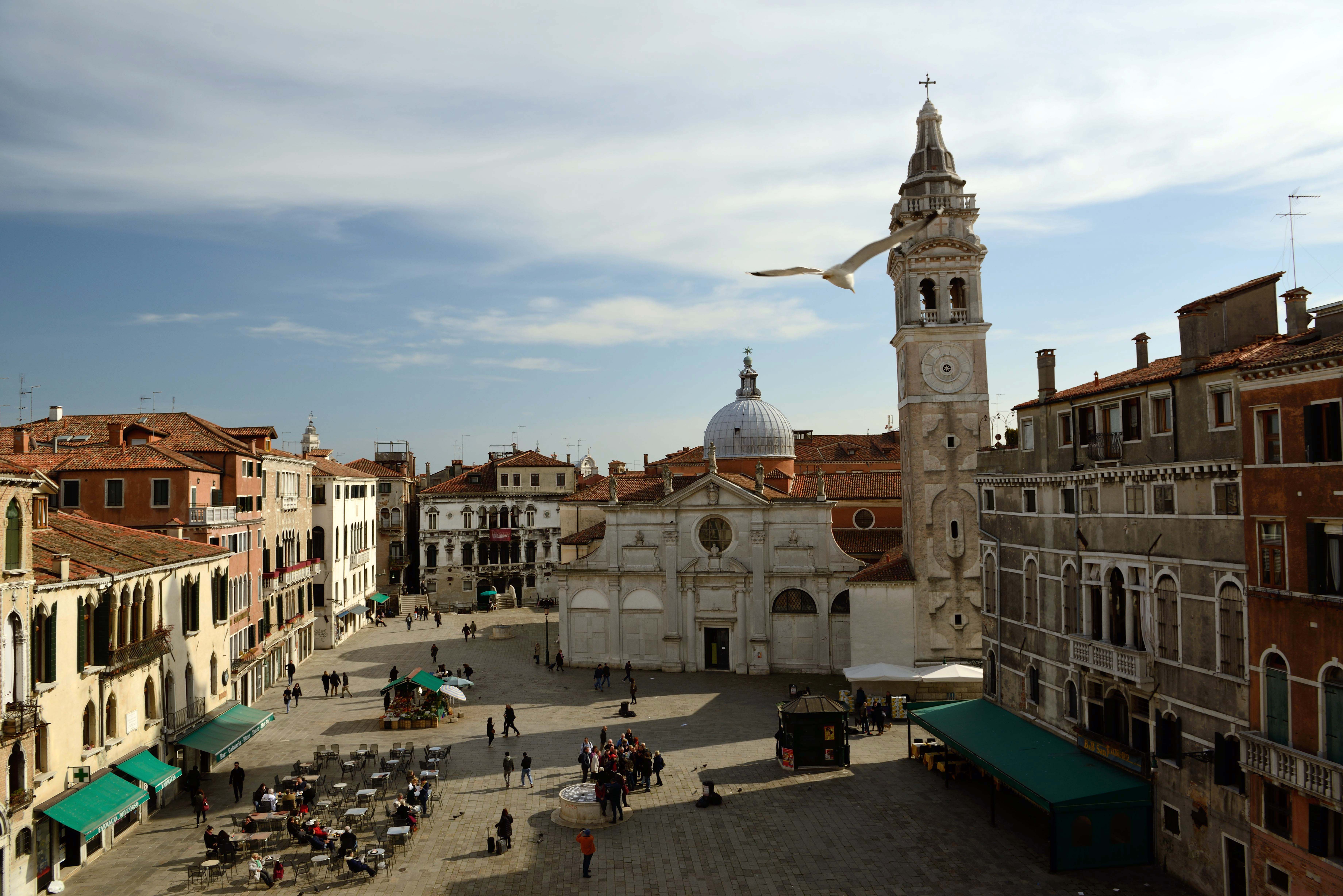 На фотографии Венецианская площадь. Средневековые здания, церковь с колокольней, площадь со столиками небольшого ресторанчика и яркое средиземноморское небо с облаками и летящей чайкой. Кадр скорее светлый, резкие тени в правом нижнем углу немного притеняют общую атмосферу вечерней Венеции. Яркое солнце и геометрические формы зданий делают кадр контрастным. Кадр статичен, даже не смотря на летящую чайку. В основном эту атмосферу создают дома с многовековой историей, церковь и мирно сидящие за столиками люди (практически нет идущих пешеходов). Главным в кадре выступает церковь с чайкой (хотя при съемке мыслей выделить какой-либо объект не было). На мой взгляд это получилось по трем причинам - геометрическое расположение (именно там сходятся трети), наличие самого высокого объекта на контрасте с небом и перехода из тени в свет. Ассоциации достаточно банальны - отличное спокойное место для отдыха. Покой и умиротворение. Вечерняя сиеста.