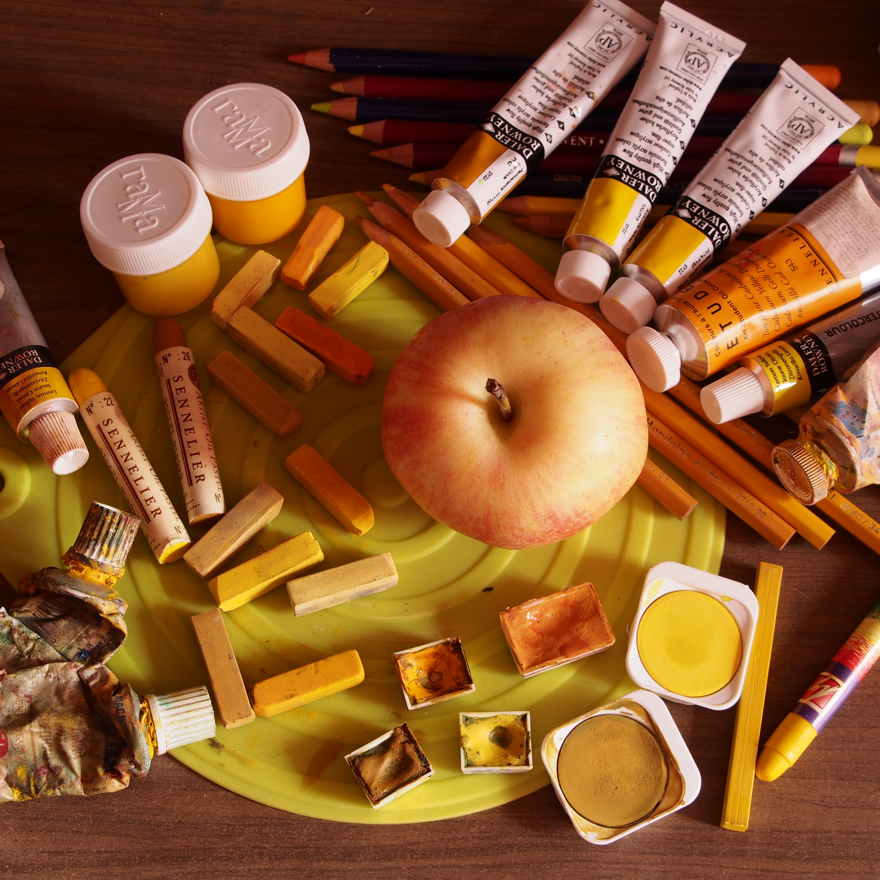 Сегодня решила устроить желтый день. Точнее, я придумала желтую тему для фото- проекта. Из всего отснятого, наверное, эта фотография мне больше всего нравится. Идея фотографии в том, чтобы показать как можно больше оттенков желтого... я достала желтые краски (акварель, масло, пастель сухую и масляную), акварельные, чернильные, пастельные и графитовые карандаши... все это разбросано в художественном беспорядке на желтой подставке, ну и для оживления композиции добавлено желтое яблоко (почти по правилу третей, но не совсем)... Учусь видеть и передавать свет. Снято со штатива