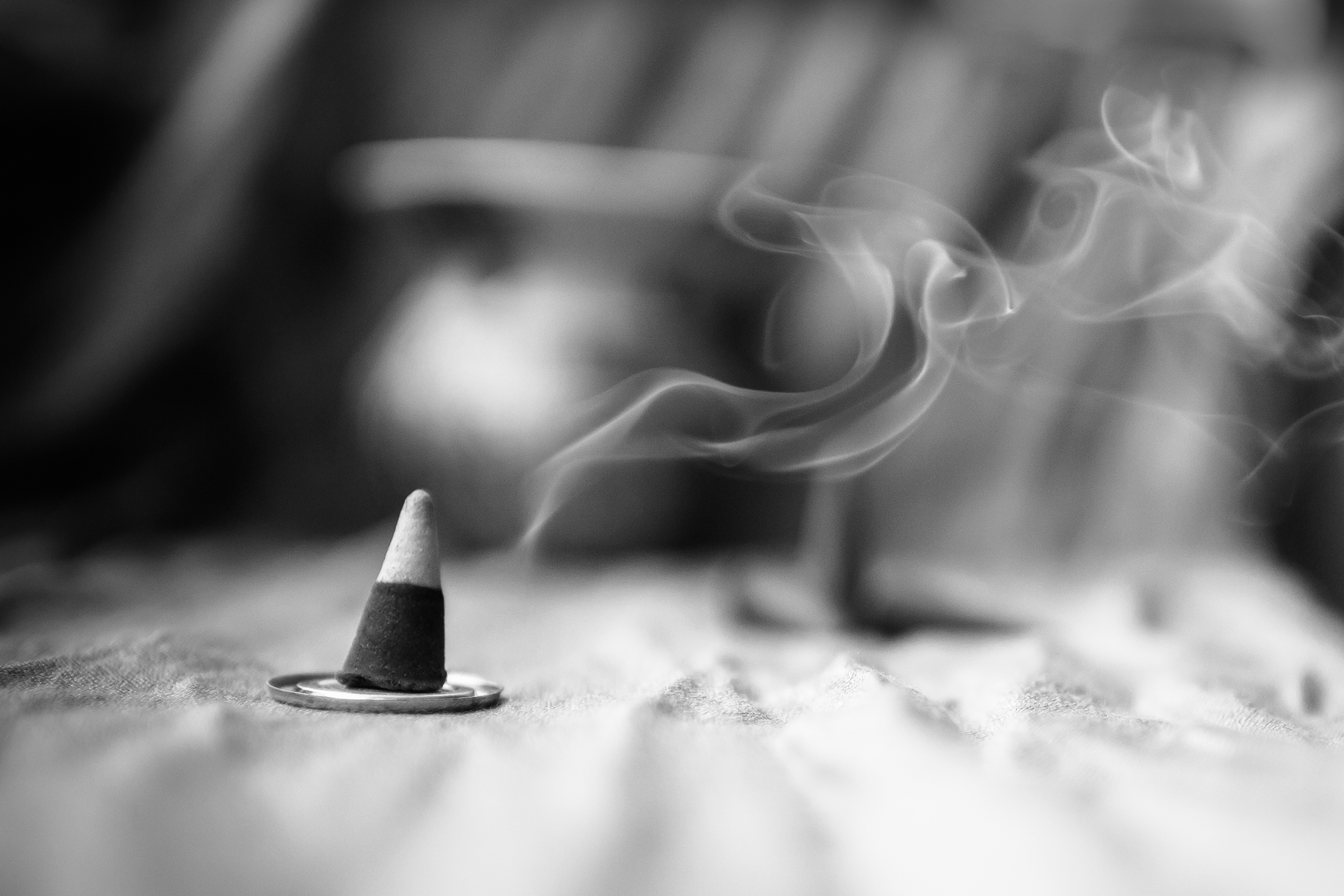 Ароматическая свеча грамотно размещена в кадре на вертикальной линии силы, в соответствии с правилом третей, и дымок направлен в нужную сторону, к дальней границе кадра.