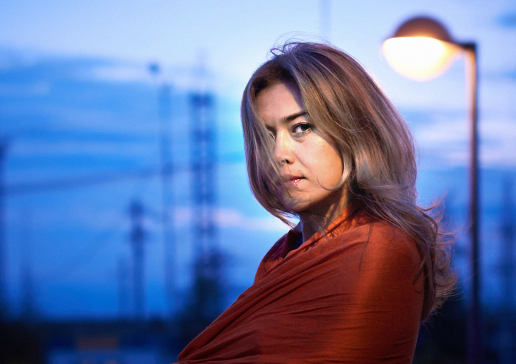 Фон холодный и даже отталкивающий и девушка на контрасте, в теплого оттенка палантине, словно светлое пятнышко!