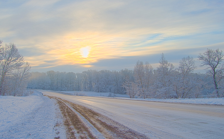 Прекрасная работа! Получилась мягкая по-зимнему картинка. Красивое небо, очень симпатичная деталь - отражение солнца на дороге. Цвета прекрасные, слегка холодные. И в целом изображение выглядит примерно так же, как видел бы такой сюжет человек своими глазами. Вы правильно подготовили исходники и "собрали" снимок.