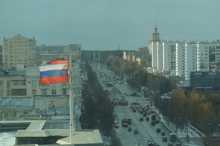Флаг удалось выделить цветом, он заметно отличается от общего серого фона города, который так выглядит из-за идущего снега.