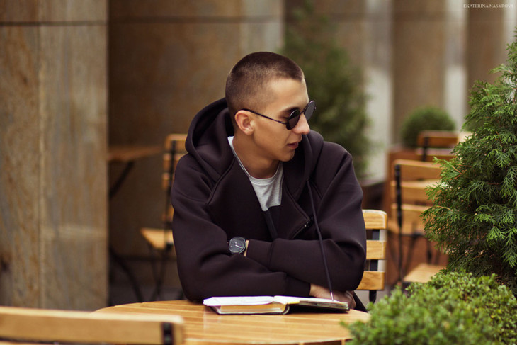 Так как взгляд модели направлен вбок, в этом направлении лучше оставить больше пространства. Сейчас модель полностью закрыт от зрителя - закрытая поза, глаза спрятаны за очками, взгляд упирается в край кадра. Создается ощущение, что человек в кадре лишний, несмотря на выделение компоновкой и фокусировкой. Лучше все-таки показывать глаза модели в кадре, чтобы снимок получился более эмоциональным.