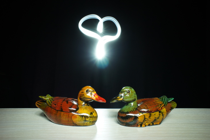 В целом снимок кадр выглядит вполне выразительно! Две фигурки уток создают визуальное подобие и некоторый пример симметрии по форме. Световой рисунок сердечка отлично дополняет общую композицию. Кадр выглядит взвешенно и цельно за счёт удачного ракурса съёмки. Технические параметры камеры установлены верно, продолжайте в том же духе!