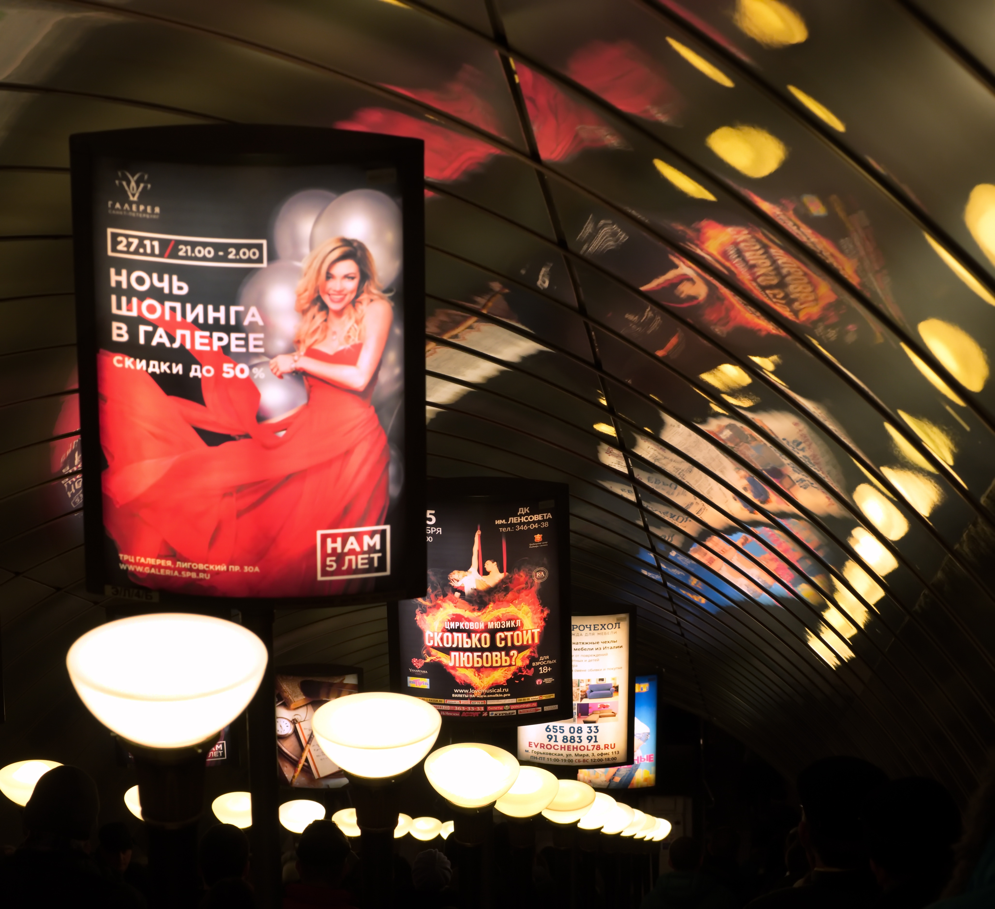 Интересный кадр! Очень здорово играют отражения, заполняя унылый спуск ощущением праздника. Еще и девушка в рекламе с явно позитивным настроением, в красивом платье - как раз под огонечки на стене.