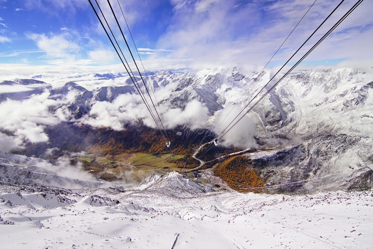 Нравится, как линии канатки ведут взгляд к смысловому центру - пятну с зеленью. И окружающие его белые горы служат рамкой, которая дополнительно выделяет главный объект.