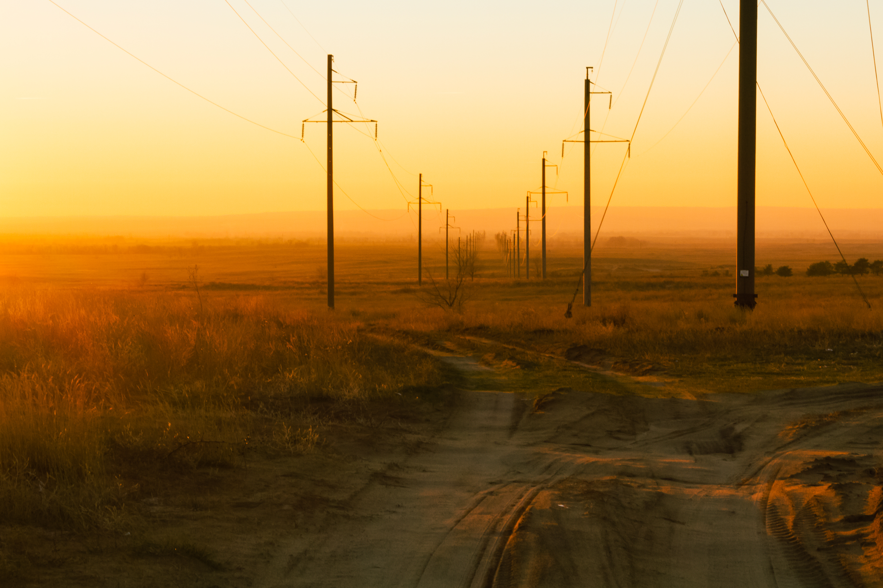 В кадре несколько ведущих линий - сначала взгляд останавливается на развилке проселочной дороги, которая расходится, затем внимание идет вслед за столбами по направлению вглубь кадра, к горизонту.