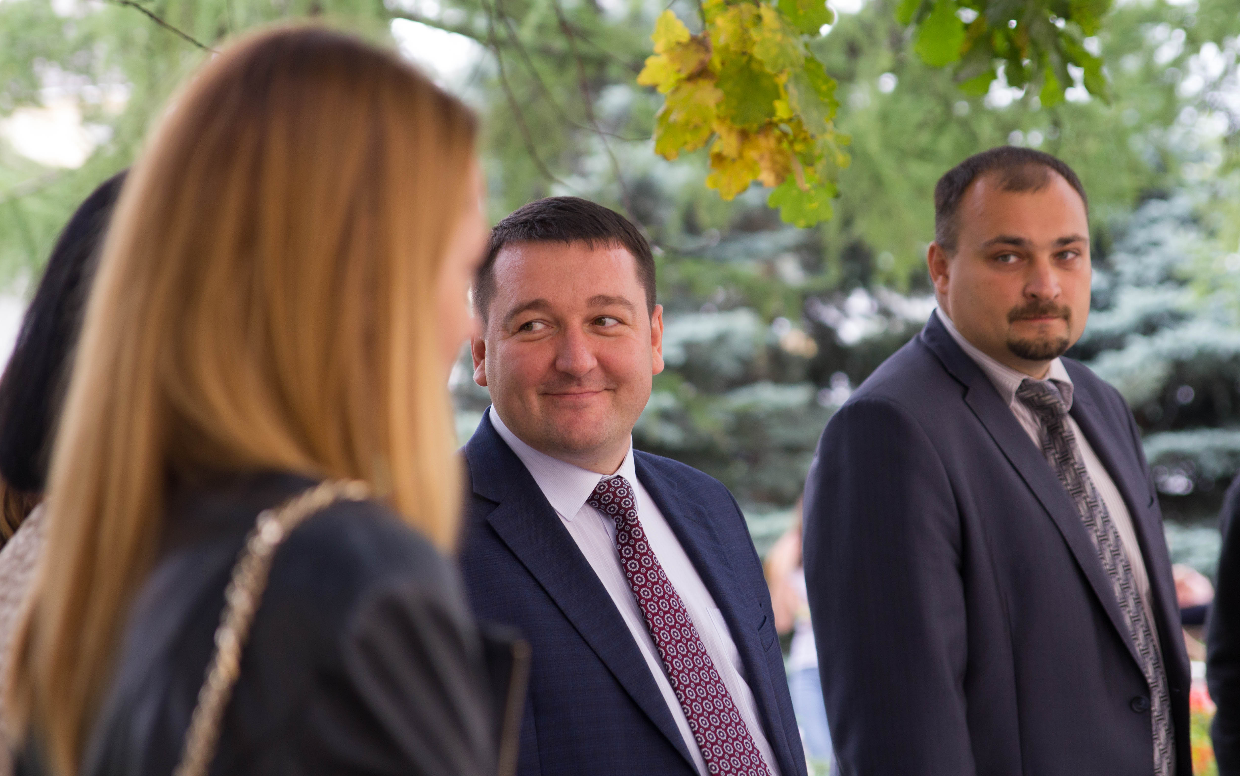 На фотографии изображены три человека: двое мужчин на заднем плане повернуты лицом и женщина на переднем - в пол оборота. Мужчины увлечены происходящим за левым краем фотографии. Преобладает светлое, в связи с чем фото выглядит радостным. В фотографии много черного и синее цвета, т.к люди в кадре одеты в строгие костюмы. Кадр довольно статичен, но положение тела людей направлено в право, а мужчина в центре повернул голову и улыбается. Главным героем фотографии является мужчина в центре. Остальные люди - второстепенные и поэтому не в фокусе. Этим фото я хотела "выцепить" одного человека из толпы и показать его эмоции. Фото радостное, свежее (из-за присутствия зеленой листвы).
