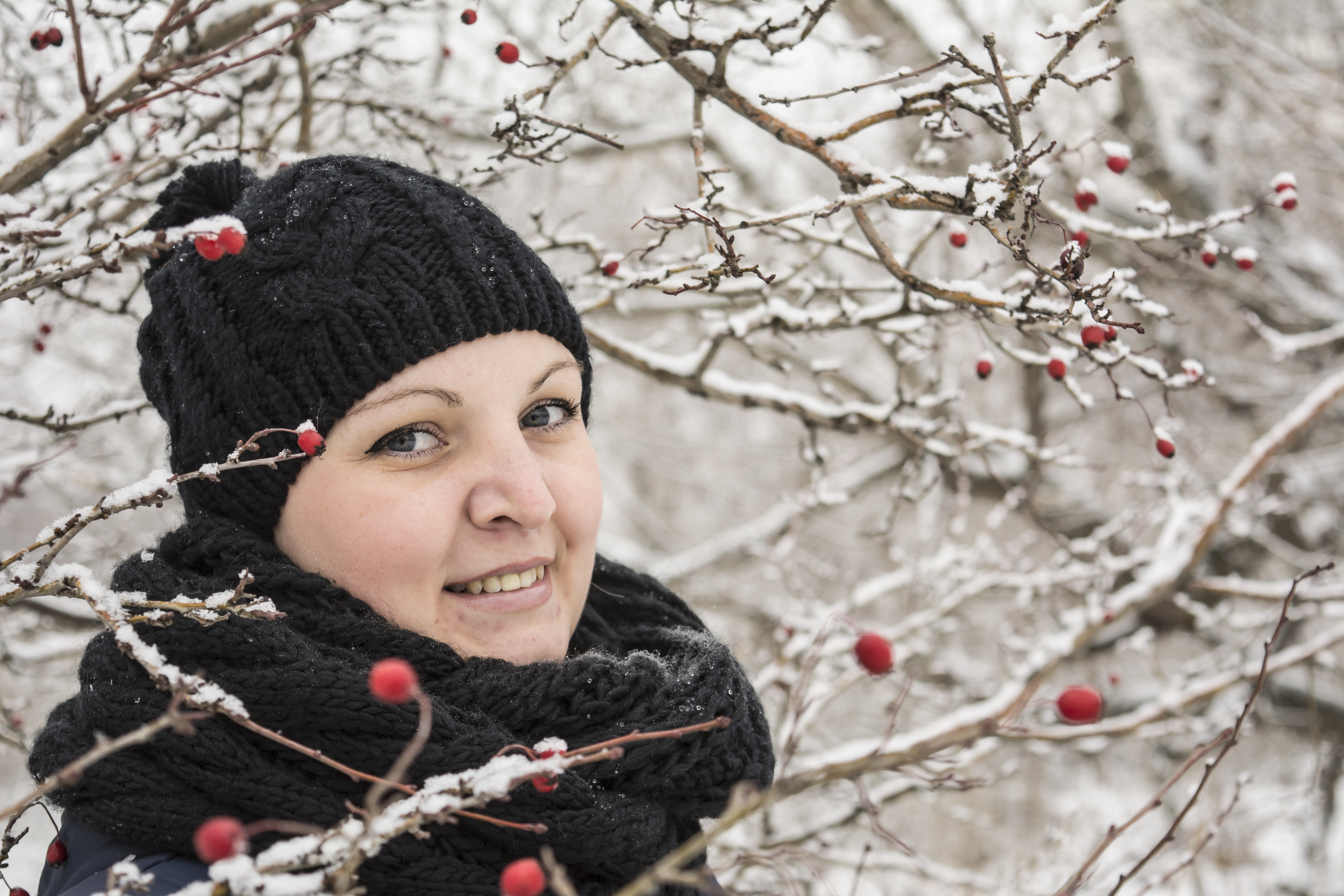 Благодаря использованию зума и съёмке на открытой диафрагме, вам удалось замечательно выделить в кадре именно девушку, а дальний план красиво увести в нерезкость. Красивое место выбрали для съёмки, яркие красные ягодки чудесно украшают сюжет, а заснеженные веточки выполняют роль естественной рамки.