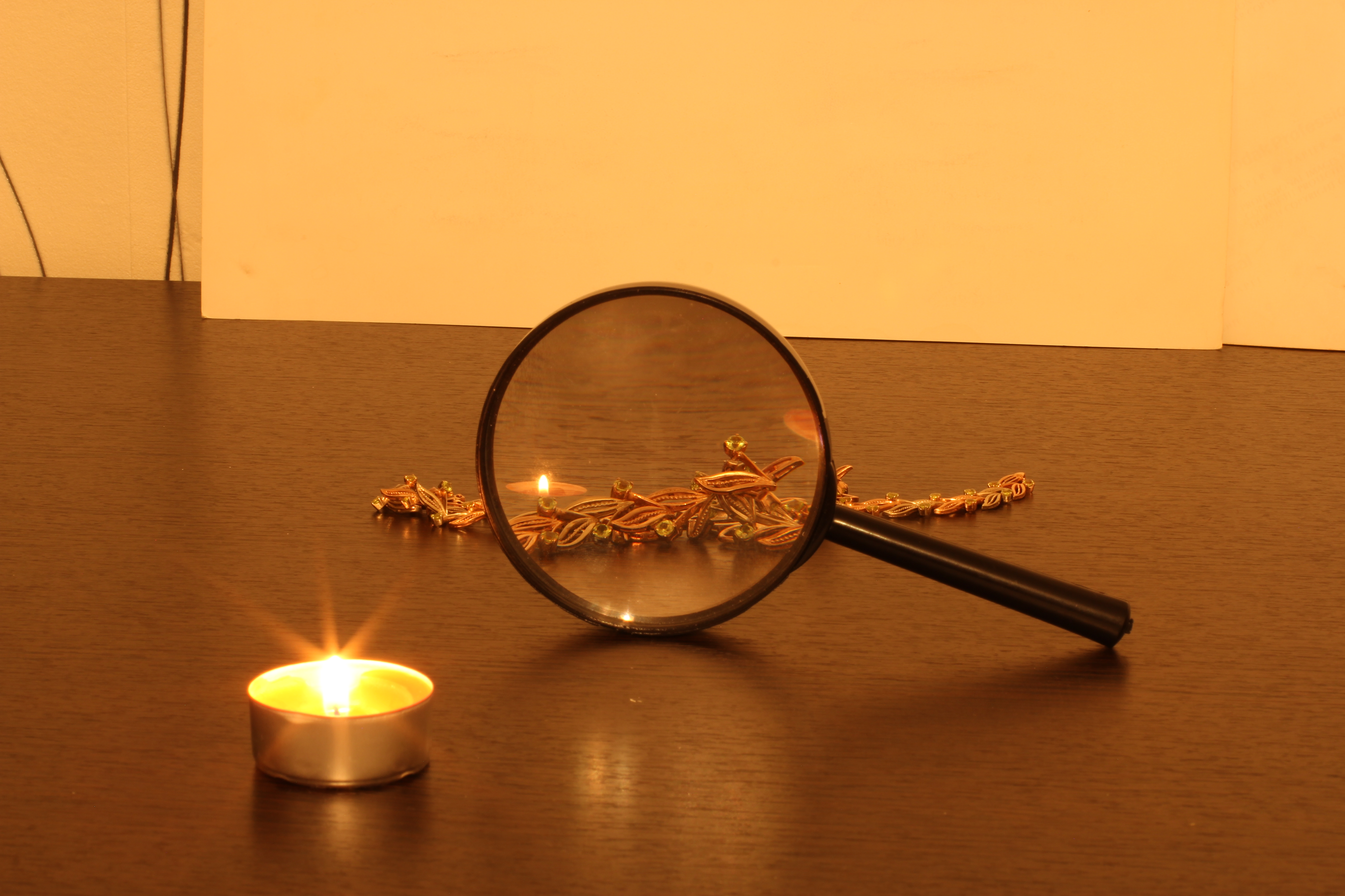 В случае со свечей, строчками книги, и увеличительным стеклом, просматривается сюжет...Вещи олицетворяют пожилого чтеца, который читает при свете свечи.