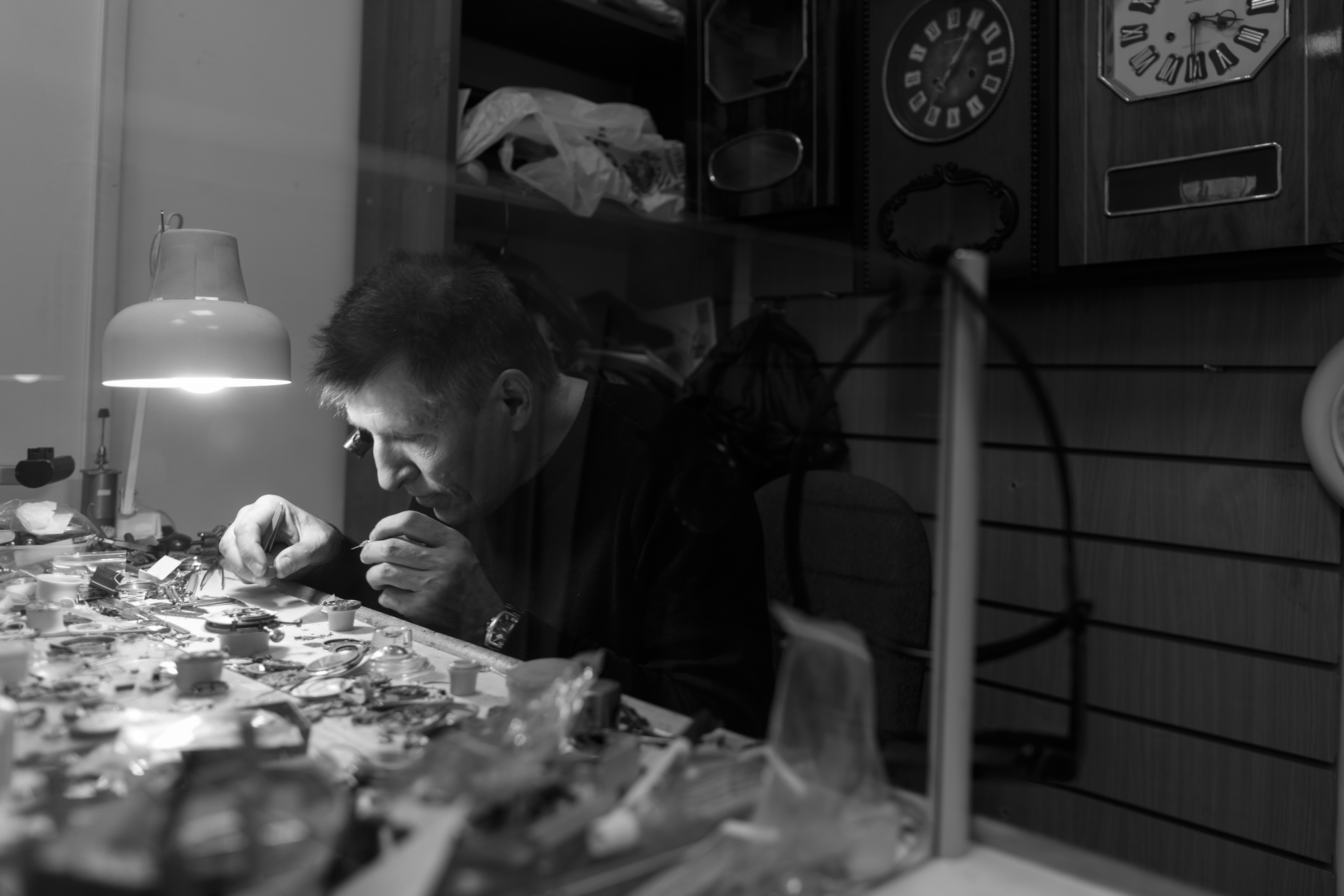 Вчера долго гулял по городу и думал ко го с фотографировать именно для этой темы искал подходящий образ и тут вспомнил, в углу большого магазина сидит мастер часов отгорожен стеклом и у него интересная обстановка )) сначала пытался сделать портрет с помощью 135 мм ну ни как не мог захватить всю атмосферу и пришлось через весь город бежать за другим объективом но не зря, тоже решил сделать в ЧБ так как очень много ярких и цветных отвлекающих деталей. Честно скажу стоял ждал когда мастер займется ремонтом часов и не обратит на меня внимания Да перед этим поставил камеру на тихий режим съемки я сделал пару кадров Но потом он все равно увидел так как объектив 24 мм мне пришлось к ним подойти очень близко , долго мы с ним разговаривали о том что я пытался сделать )) он стал показывать свои ЧБ фотографии когда был молодой на практике. Как то так родилась эта фотография