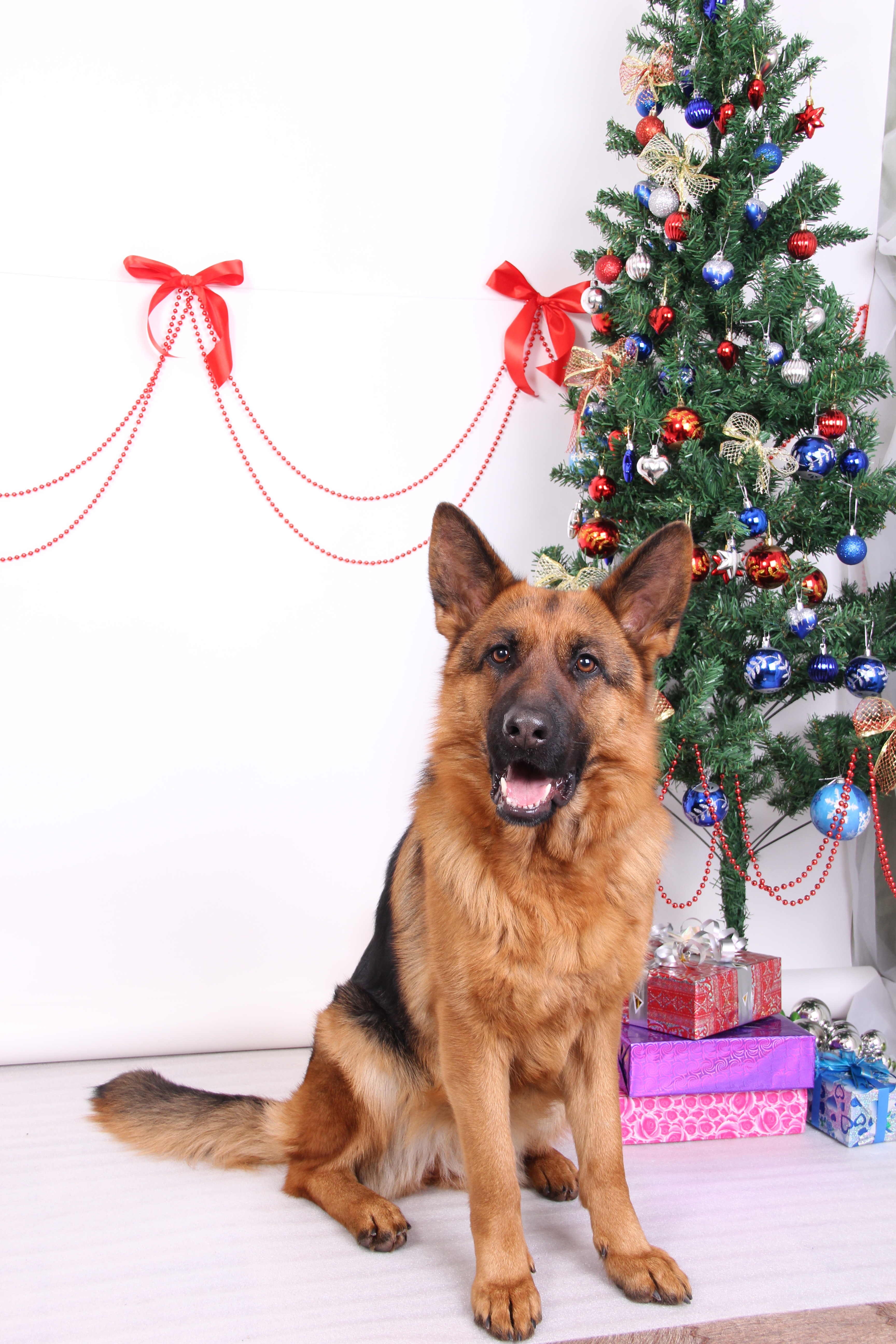 Фон действительно не очень гармонично скомпонован. Елочку вполне можно и кадрировать, но тогда лучше взять более крупный план, чтобы голова собаки была на уровне верхней трети снимка - сейчас сверху много пространства, а елочка все равно обрезается. Кроме того, композиция перевешивает вправо: слева фон практически пустой, справа много деталей. В идеале бы его более гармонично скомпоновать.
