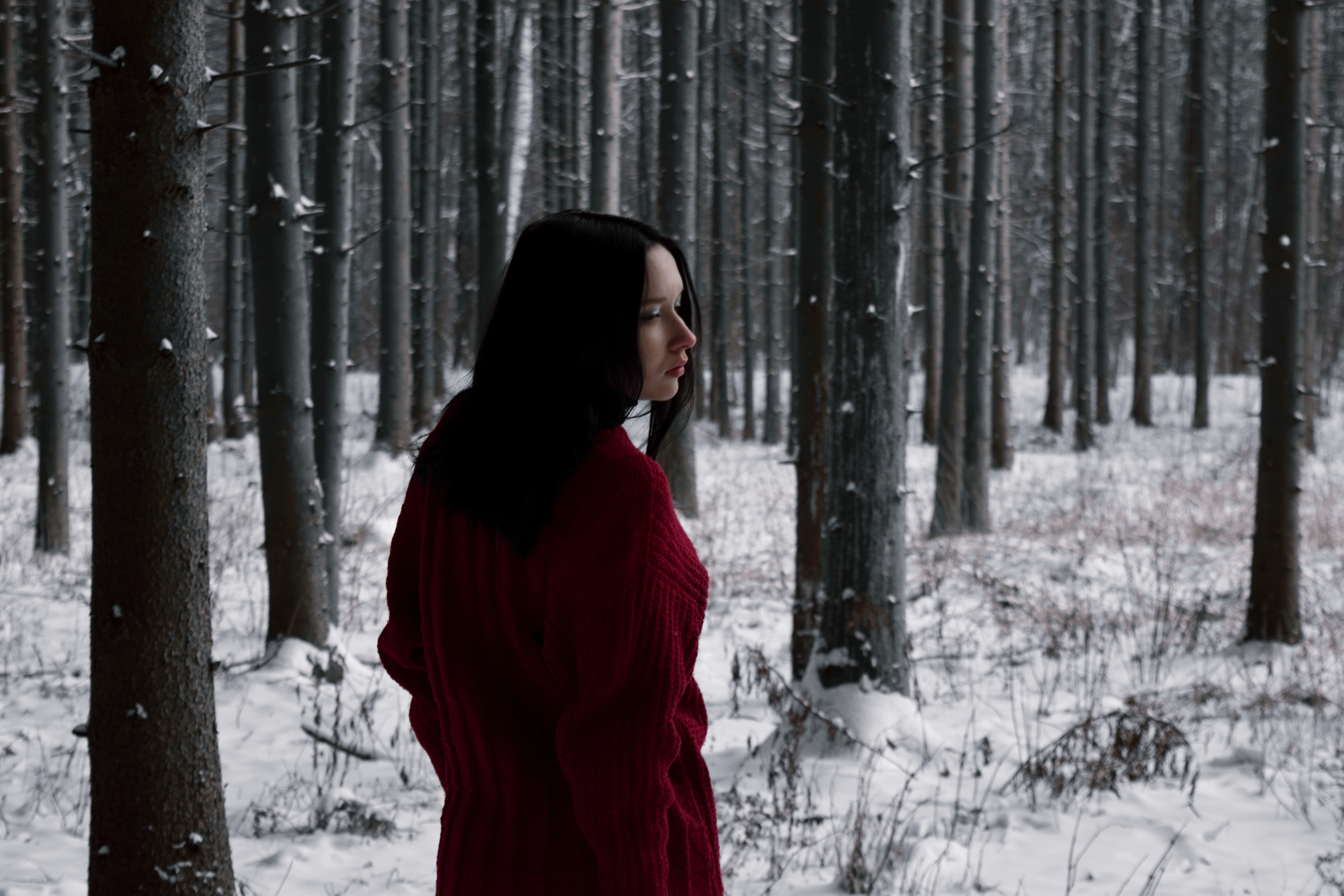 Интересная фотография, очень выразительный и драматичный образ - отлично получилось передать в кадре атмосферу. Выделение красного подчеркнуло монохромность зимнего фона и помогло создать акцент на модели. Прекрасно смотрится ритмичный фон из стволов деревьев в легком размытии.