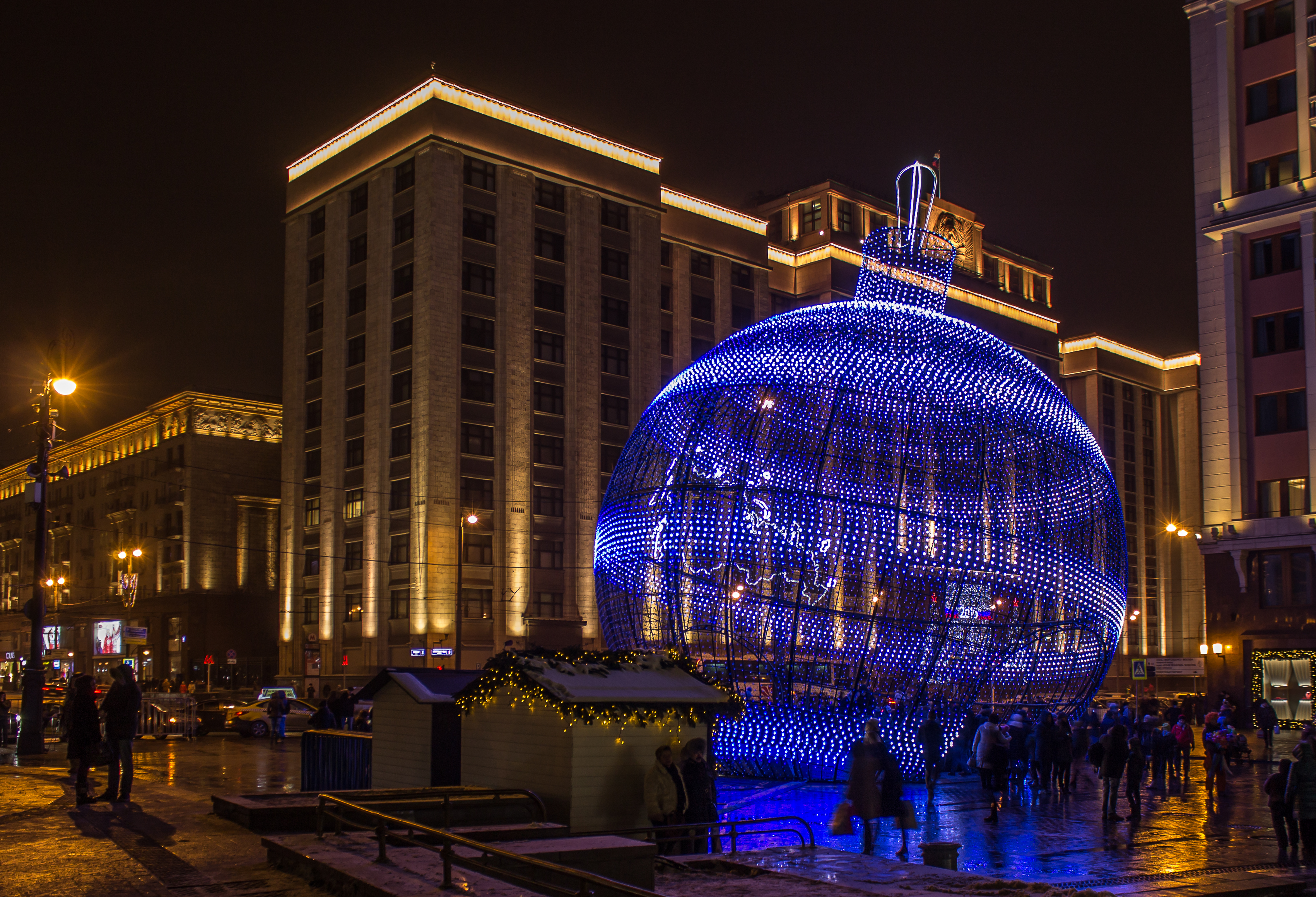 При вечерней съемке удалось передать интересное сочетание теплого и холодного света. Игрушка тянет внимание сочетанием объема и синего цвета среди теплого желтого. Вы удачно сместили шар в сторону, дав возможность исследовать пространство и оценить то, как эффектно вписана световая скульптура в улицу.