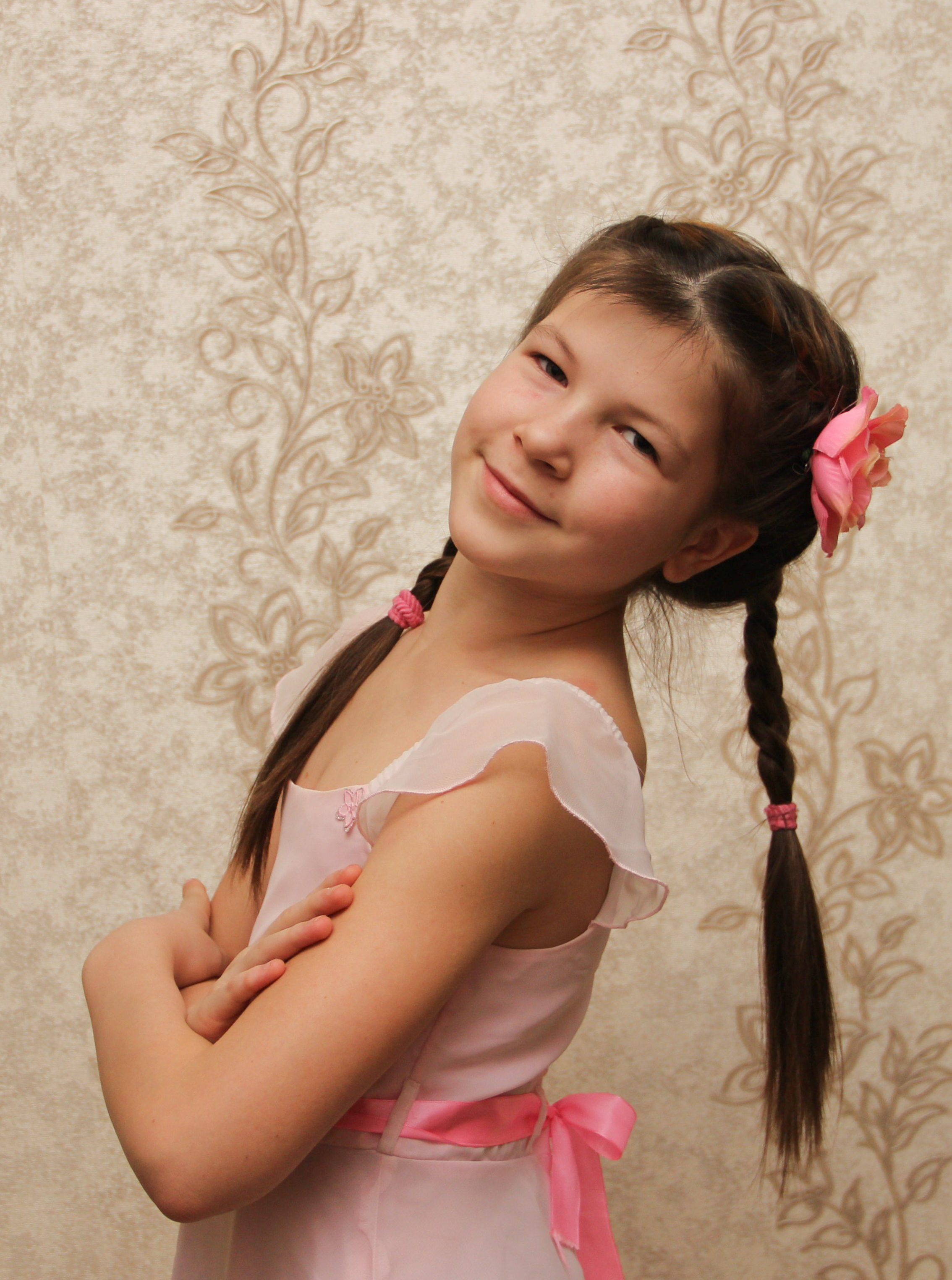 И поза мне нравится. По-моему очень даже хорошо получилось. Скомпоновали кадр отлично. Лицо в центре наибольшего зрительского внимания находится. А тело и наклон головы формируют восходящую диагональ на фотографии. Диагонали делают снимок динамичнее.
