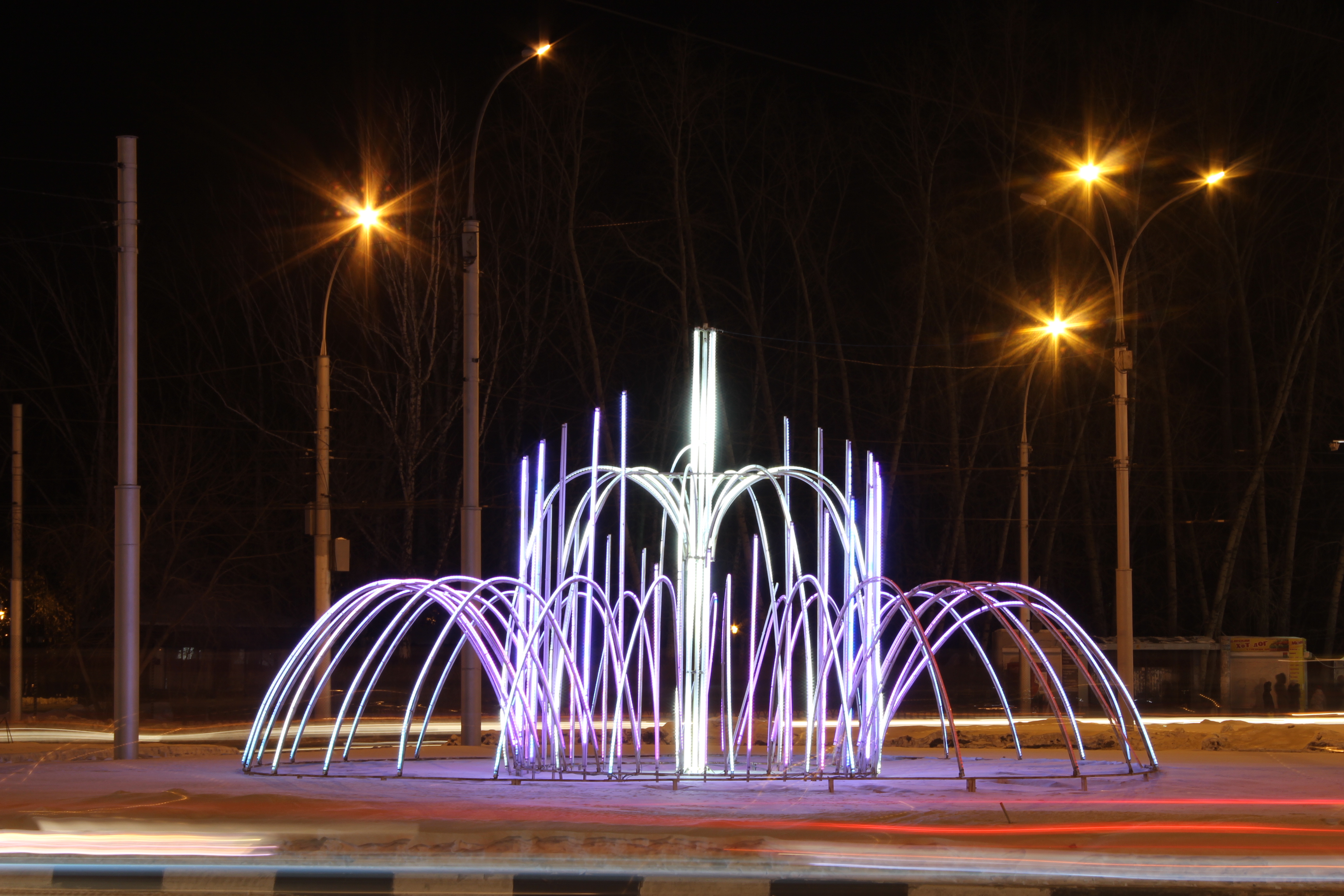 Этот сюжет ВЫ снимали на длинной выдержке, машины проезжают в нижней части кадра, от них остается световой след, который заметно не сразу. Фонтан подчеркнут , как главный объект в центре кадра. Линии света на нем намекают на движение воды. Кадр сам по себе статичен, но рассказывает о движении. В ручном режиме съемки Вы правильно подобрали параметры экспозиции. Прикрытая диафрагма увеличивает глубину резкости. Фонари украшают пейзаж красивыми лучами.