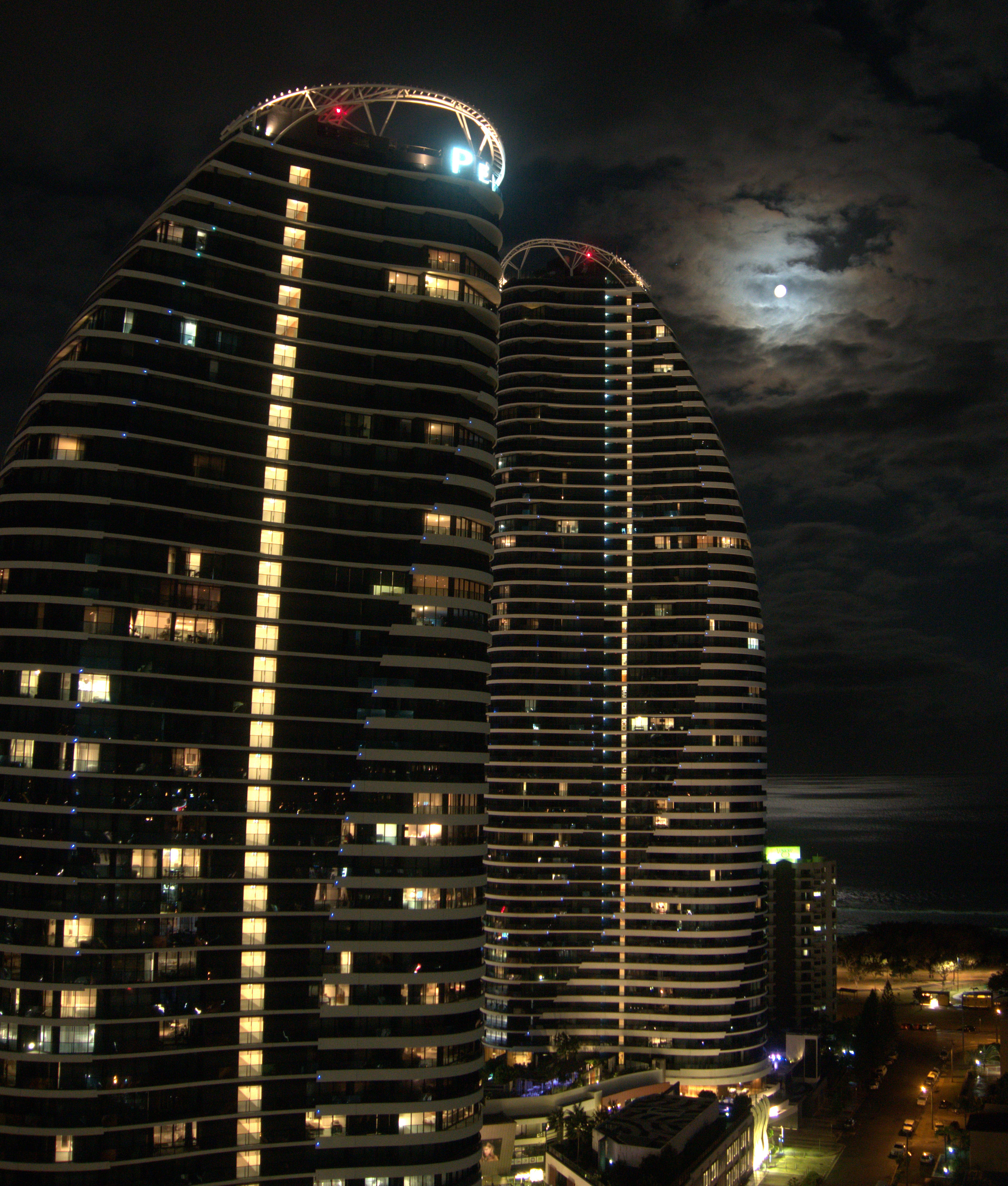 Австралия. Gold Coast. Необычный гостиничный комплекс, построен в виде двух башен. Очень красиво подсвечивается ночью.