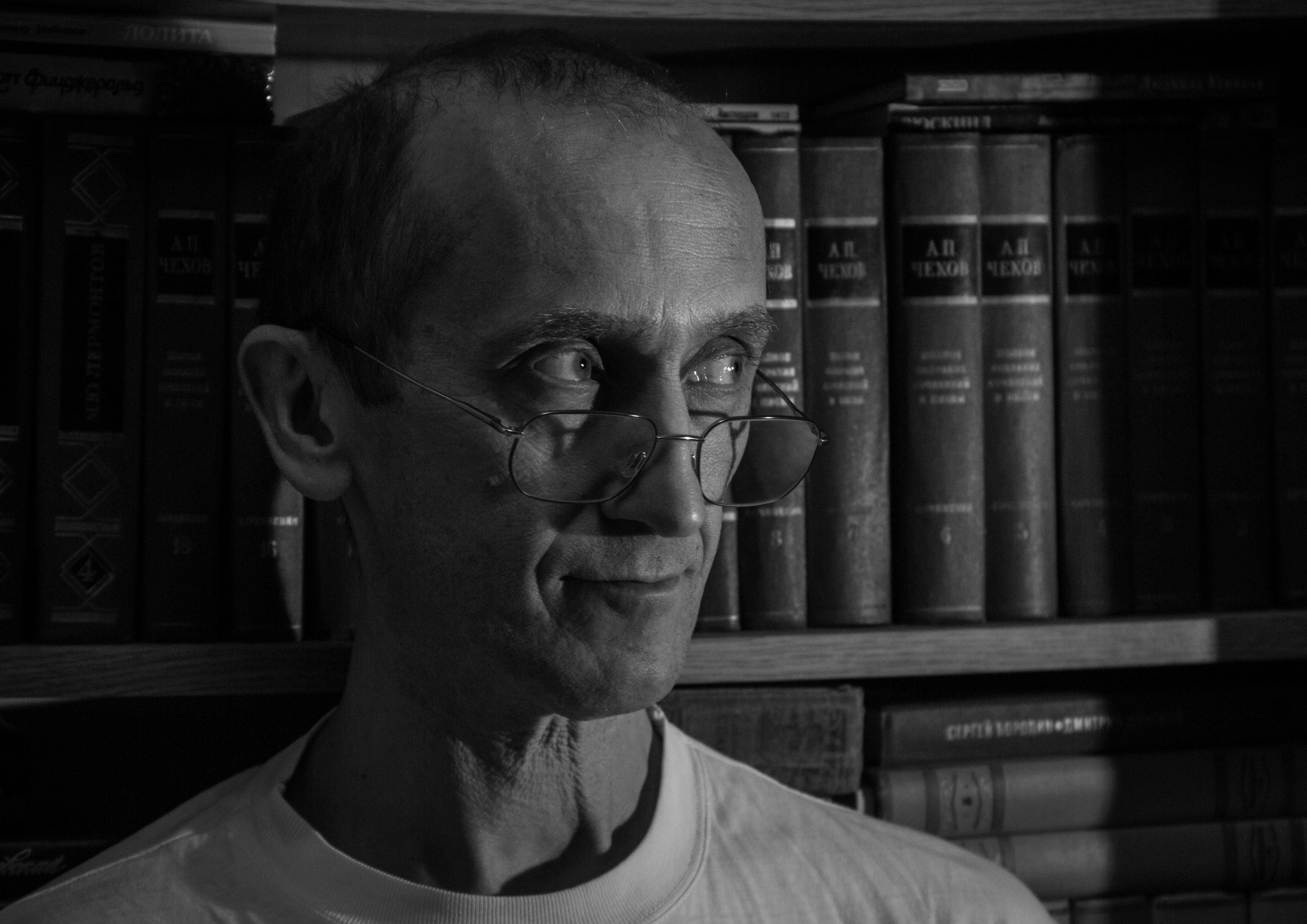 Добрый вечер! К сожалению, совсем нет времени, вот уже дотянула до последнего:) Попыталась учесть замечания и рекомендации. Фон - книги - на мой взгляд, хорошо сочетается с задумчивым выражением лица. Взгляд поверх очков предполагает, что человек отвлекся от чтения на какую-то свою мысль. Вспышкой не пользовалась, как и предлагалось. В качестве источника света использовала лампу сбоку. Черно-белый вариант мне в портретах нравится на данный момент больше цветного, если только речь не идет о детях или праздниках.