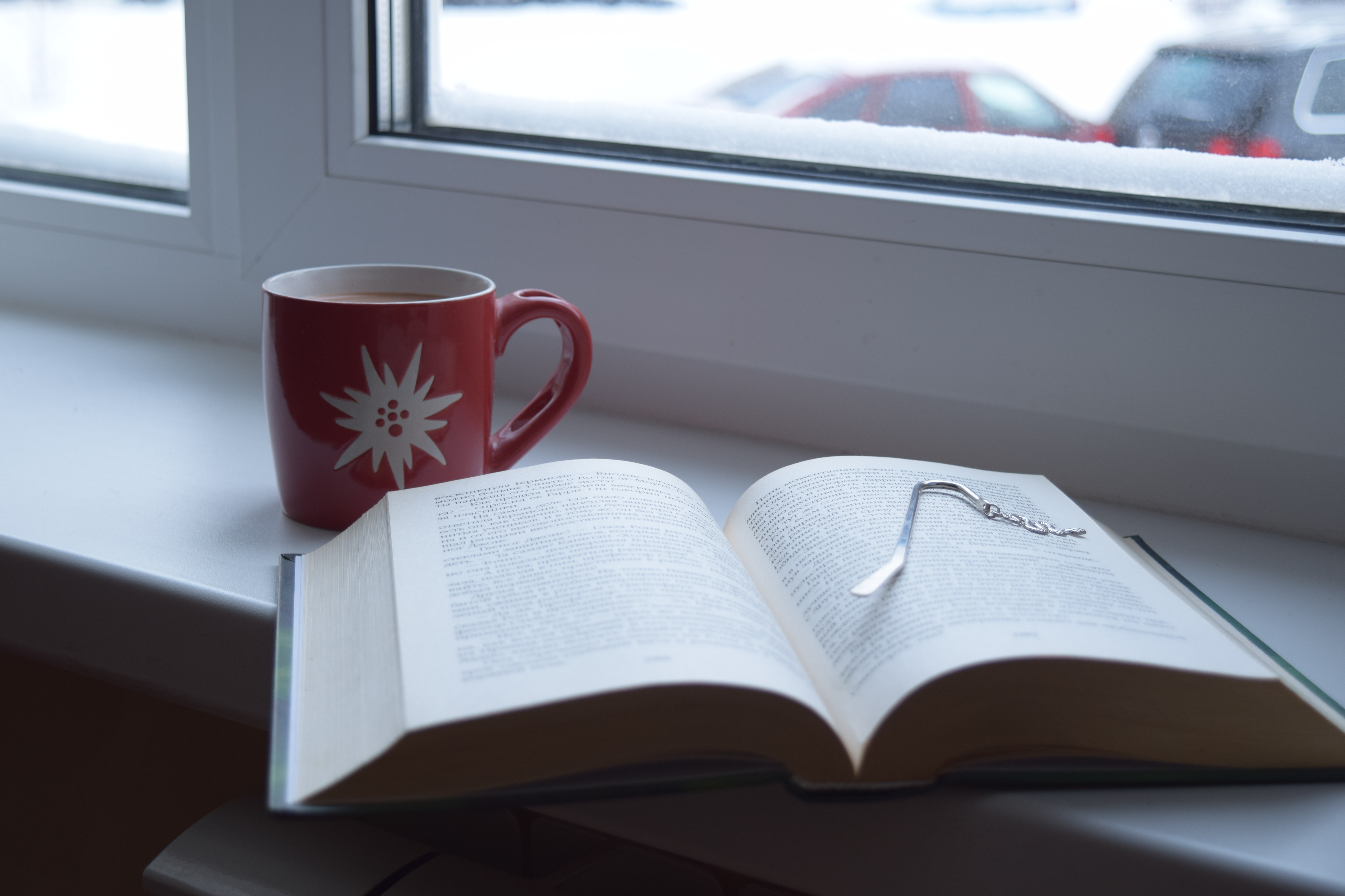 Очень хороший натюрморт. Реалистичный. Объемный. С удачным центром внимания в виде кружки и развёрнутой книги. Кружка выделяется цветом, книга симметрией форм. Всё вполне естественно и качественно.