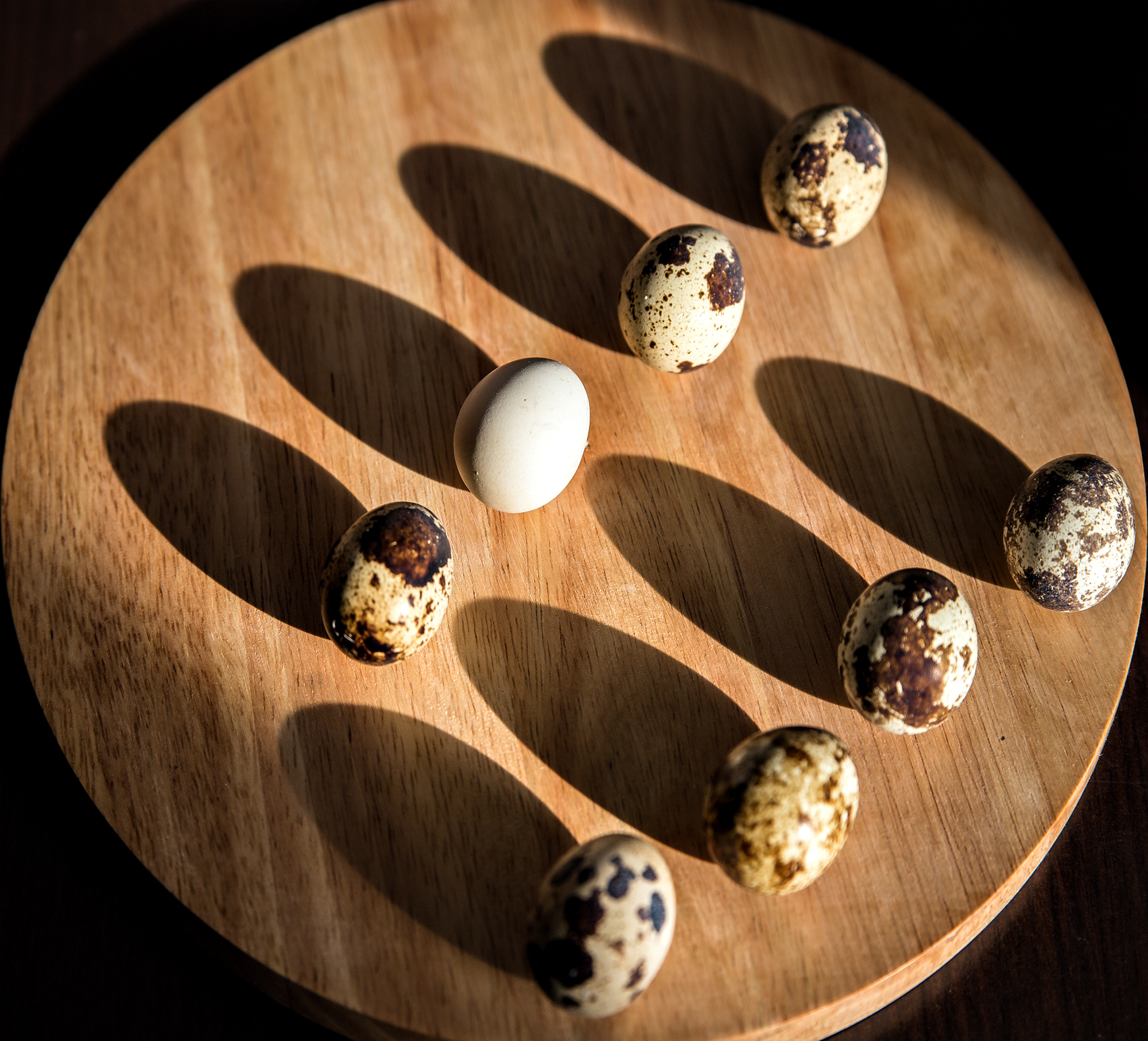 Удачно подобрали точку съемки . Круг доски усиливает внимание на яйцах.