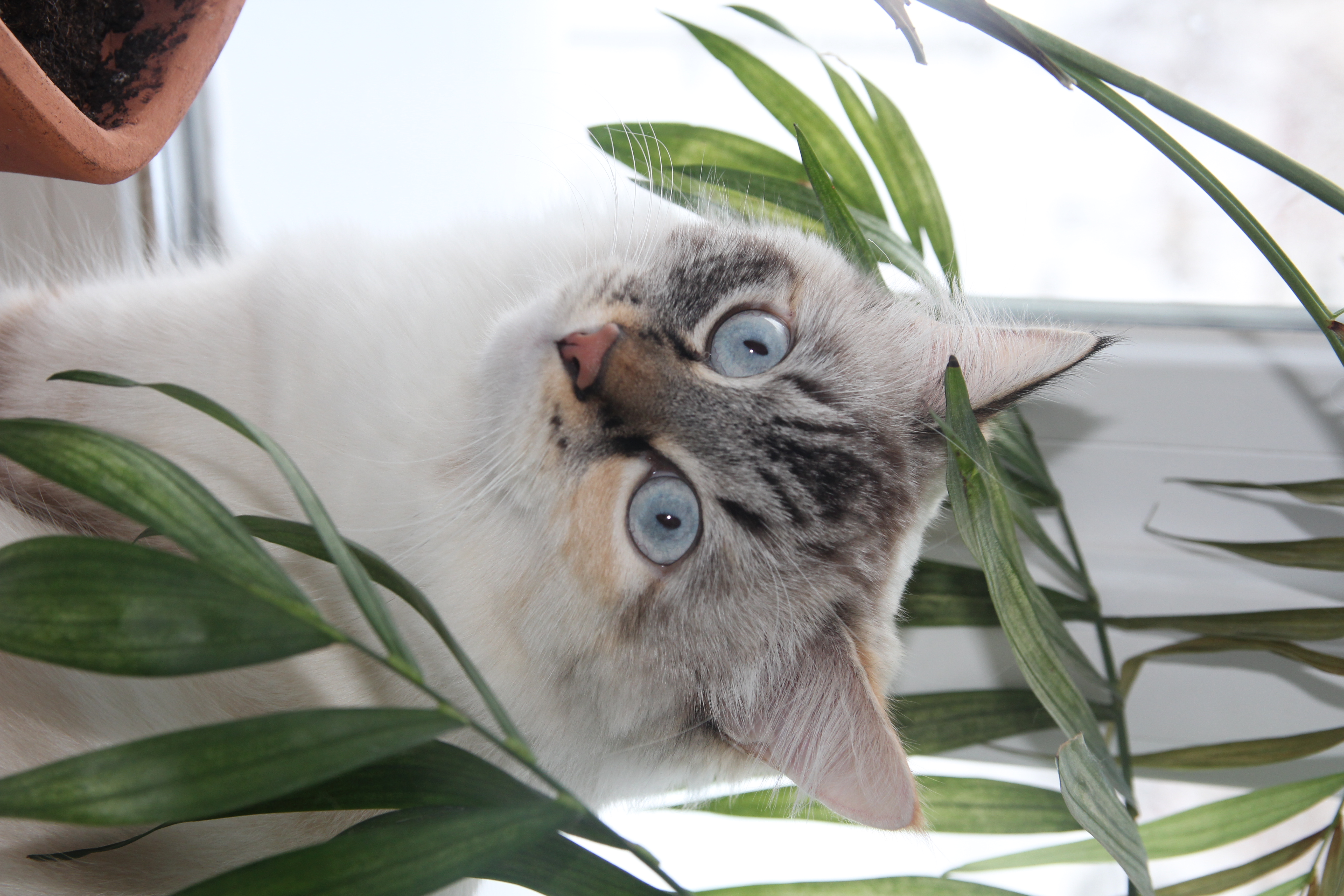 Неплохо вы кошечку поймали. Она комфортно расположилась на окошке среди зелени растений. Длинный фокус удачно использовали, то что и нужно для портретов- смогли выделить питомца, размыть задний план.