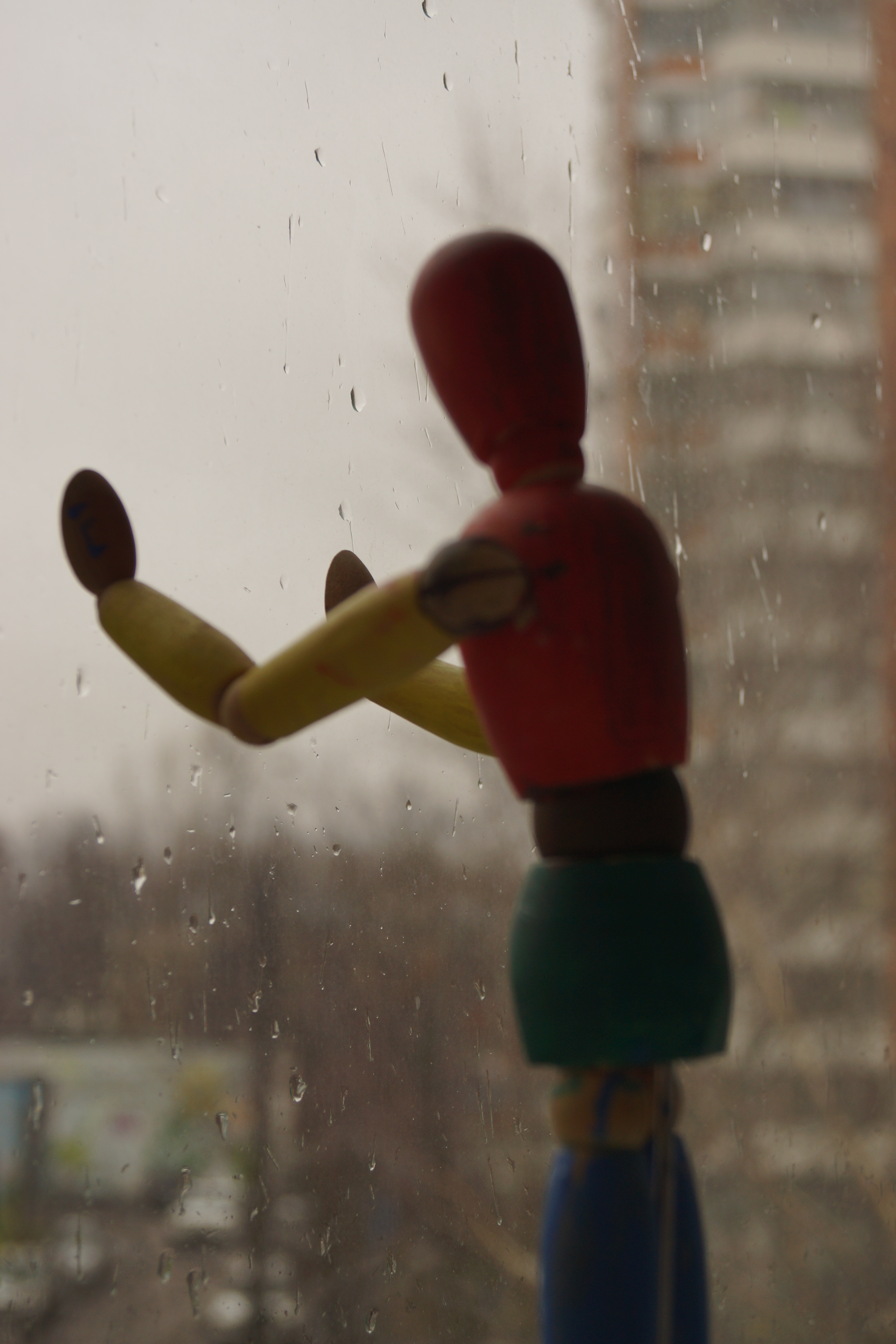 Кадр-настроение. За окном пасмурно, сыро и дождь. Безобразно разукрашенный человечек добавляет некую грусть. Чтобы заострить внимание на дожде, фокус не на саму фигурку, а как бы на капли, на окно. Фото в ручном режиме, с опоры.